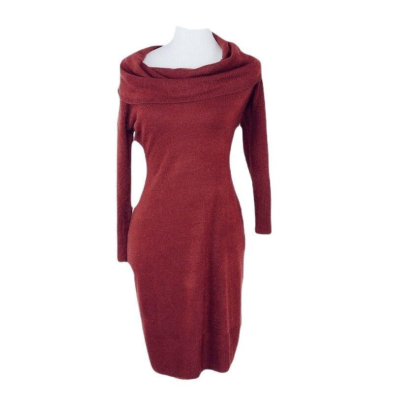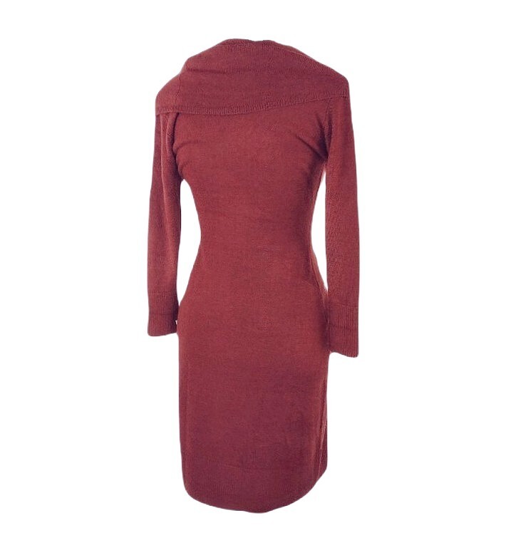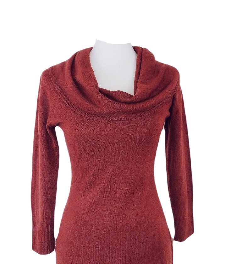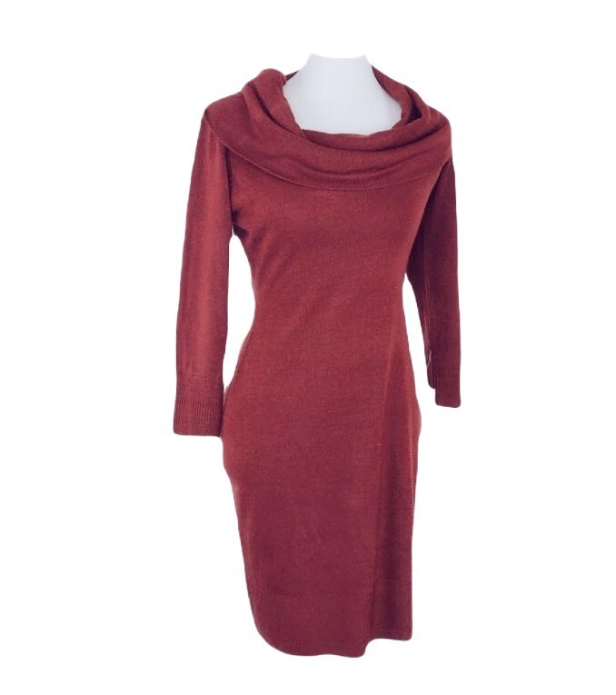 Dressbarn 100% Acrylic easy care, machine wash. Fitted, soft knit with dramatic cowl neck collar. Long sleeve. Great knit sweater dress for small frame. Measures Pit to Pit Waist 26 Hips 34 Length 36 Knit has some stretch. Excellent new with tags condition. Small