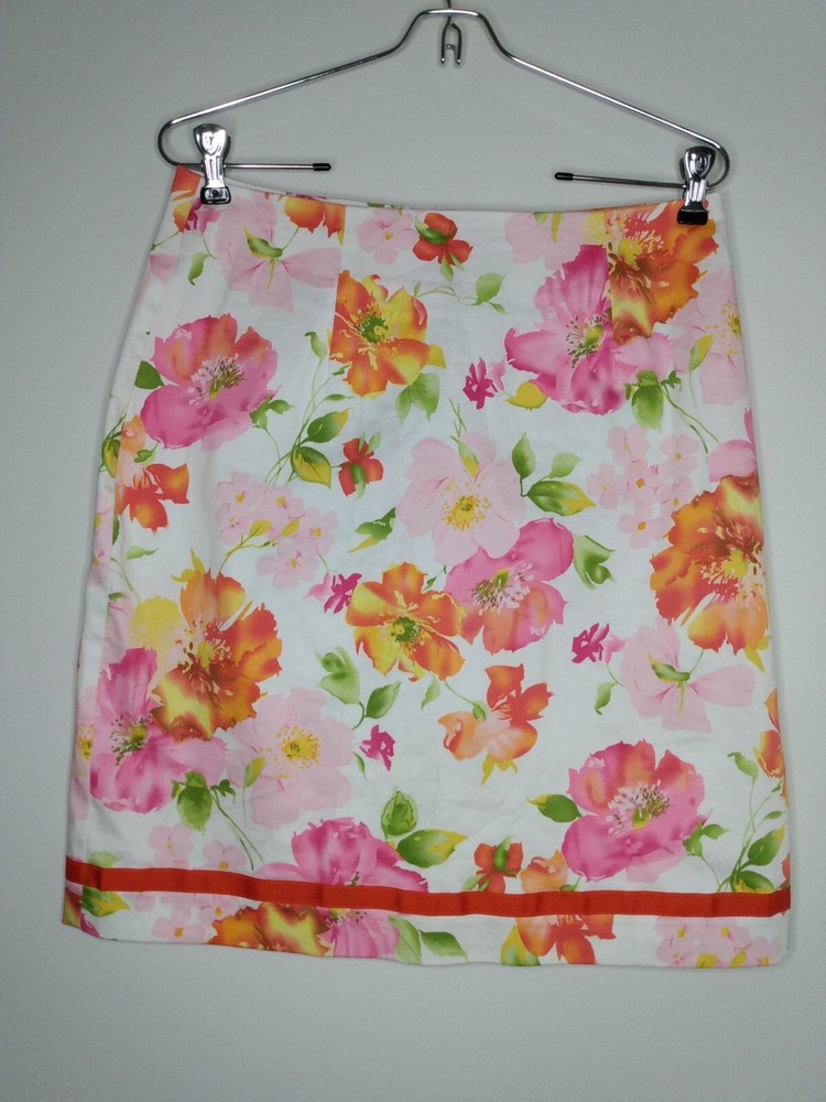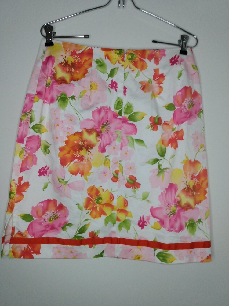 Dressbarn Dress Barn Skirt Women's Size 8 White Multicolor Pink Yellow Orange Floral Print Ribbon Trim Knee Length A Line Zipper Mid-Back Measures Waist 30" Middle Back top to bottom 20" Preowned. Still nice! Ships with tracking and care sent out by next business day!