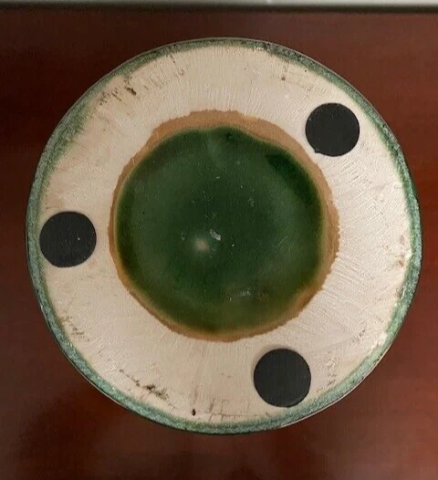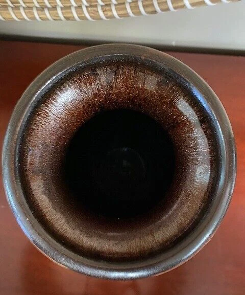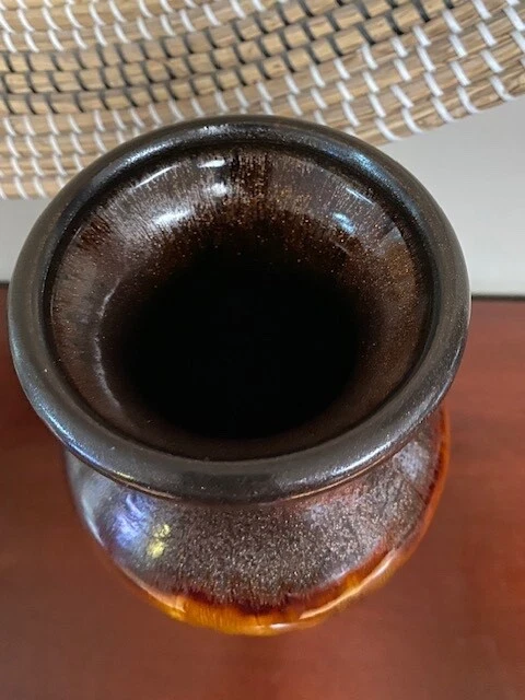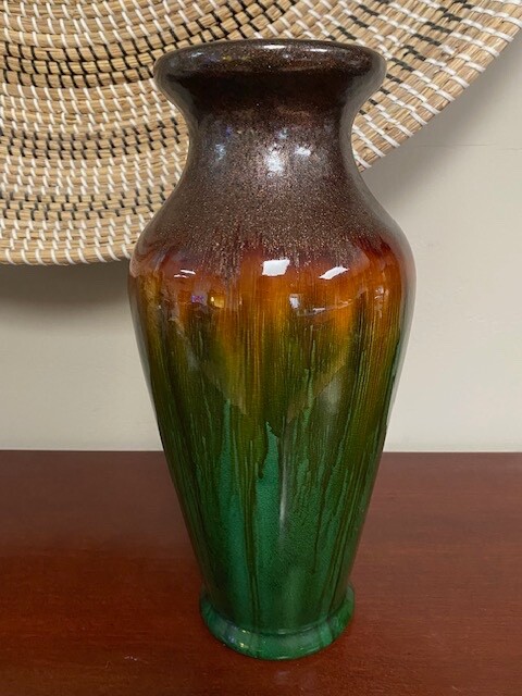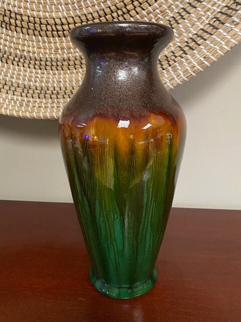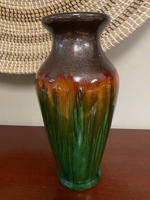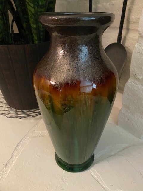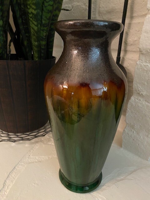 Crafted with an eye for abstract art, this 14-inch tall vase embodies the spirit of Mid-Century Modern craftsmanship. Its speckled drip glaze in soothing green, brown, and gold/orange hues creates a visually striking piece that is sure to be a conversation starter. The vase's all-over pattern and glossy finish accentuate its artisanal charm, while its substantial heft of 6 lbs. assures a stable stance on any surface. A true vintage treasure from the 1960s-1970s, this unmarked vase boasts a width of 7 inches and a top diameter of 5 inches, with a base measuring 4.5 inches in diameter. Its robust construction is evident in the high-quality terracotta and clay materials, and despite its age, it retains an originality that resonates with the aesthetics of the era. Please look at all photos as they are part of the description. Any questions, please ask prior to bidding. Thank you!