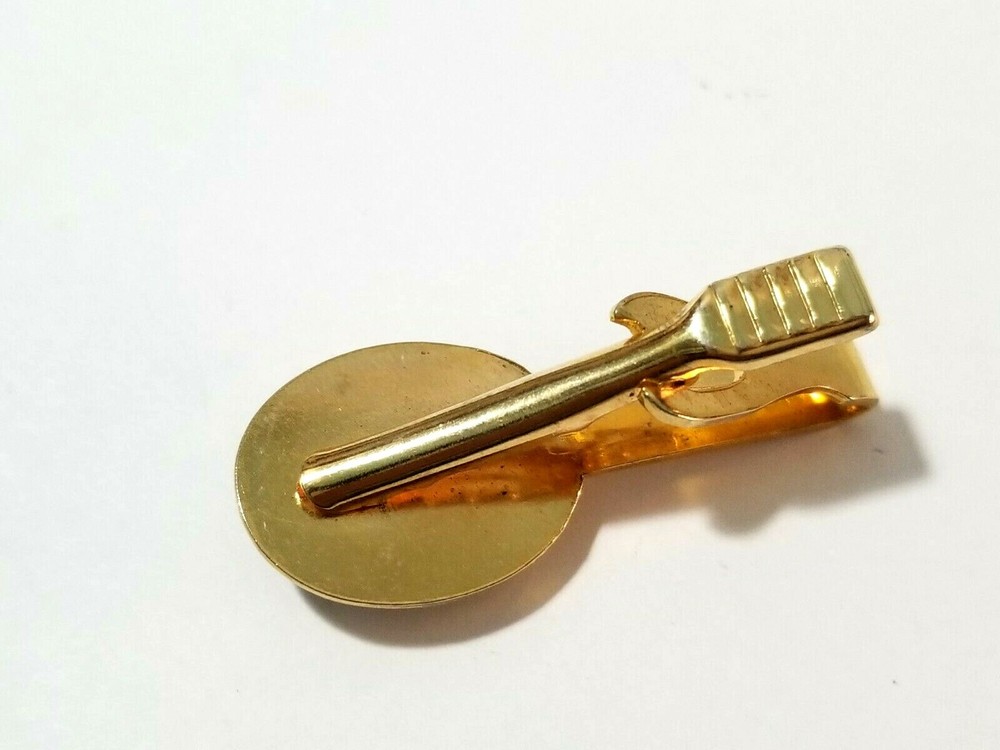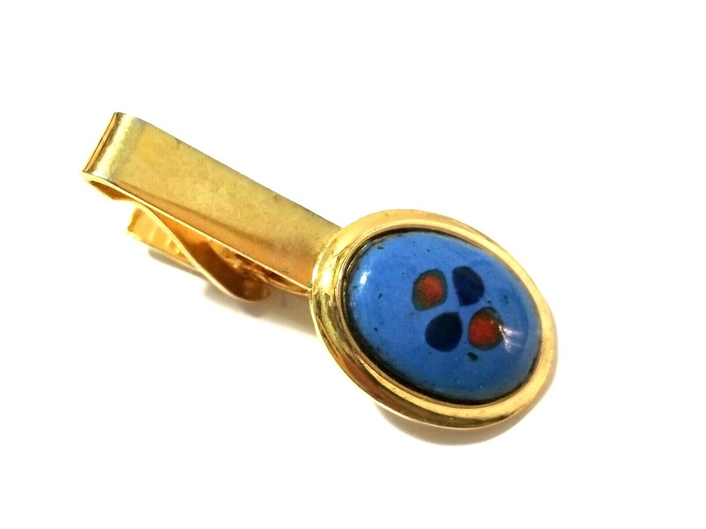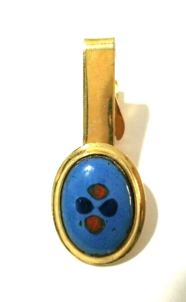 VINTAGE TIE CLIP. MEASURES APPROX. 1 5/8" LONG. THE OVAL IS 3/4" X 5/8" WIDE. BLUE ENAMEL AND ORANGE COLORED DOTS. GOLD TONE PLATED METAL. GOOD CONDITION. AS SHOWN. 020