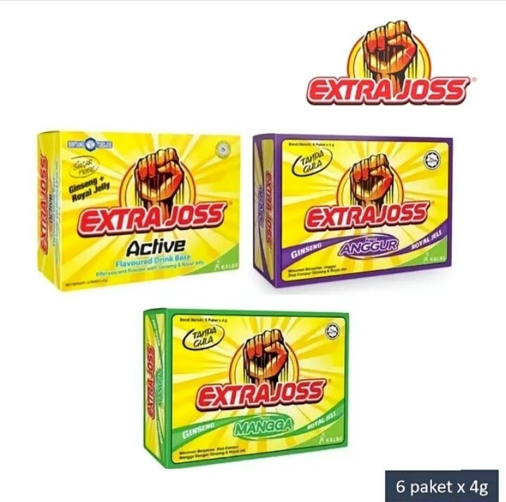 ENERGY DRINK-EXTRA JOSS(6sachet x 4gm per box). About this product Extra Joss is designed for an active lifestyle. It will recharge your working day, and is a brilliant pre-sport or workout power up. The tropical fruit flavour tastes great and is Sugar Free. The 'Active' ingredients work in synergy to assist metabolism, stimulate confidence, increase physical endurance, overcome fatigue, sharpen the senses, and enhance reaction speed. There are six single serve sachets per pack. Each sachet makes a 300ml effervescent energy drink. Added to a glass or bottle of water, it dissolves rapidly, and is ready to drink in seconds. Dilute to your own taste. Exp date: Mar 2025