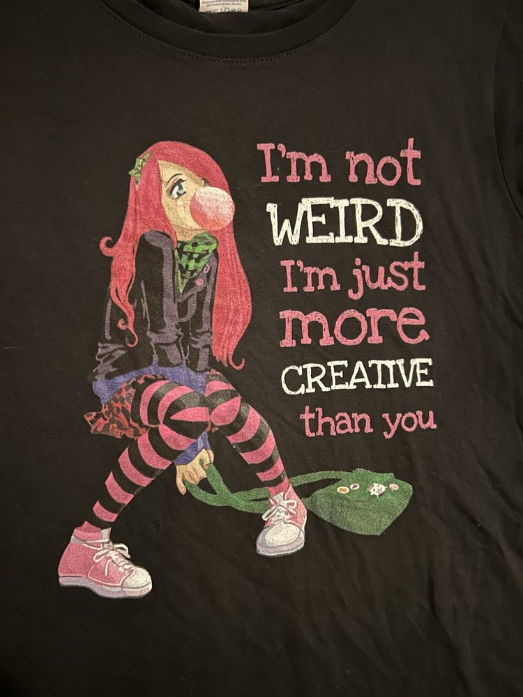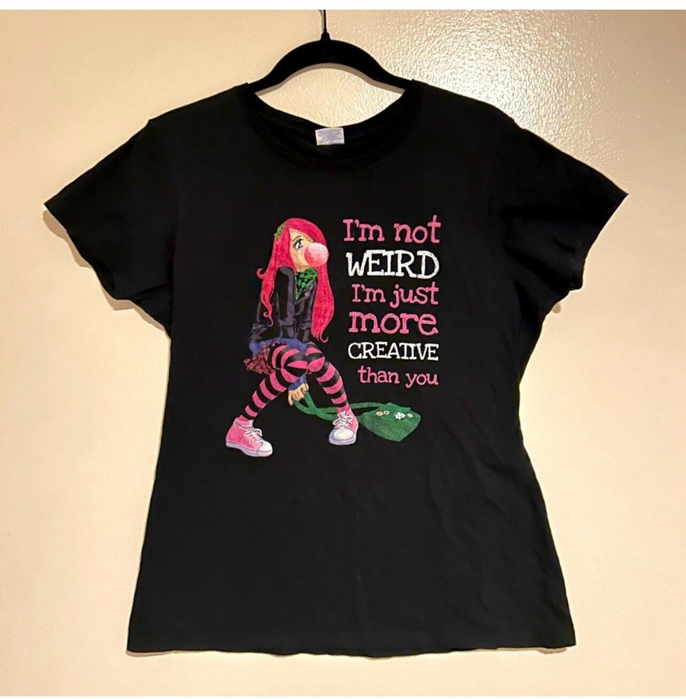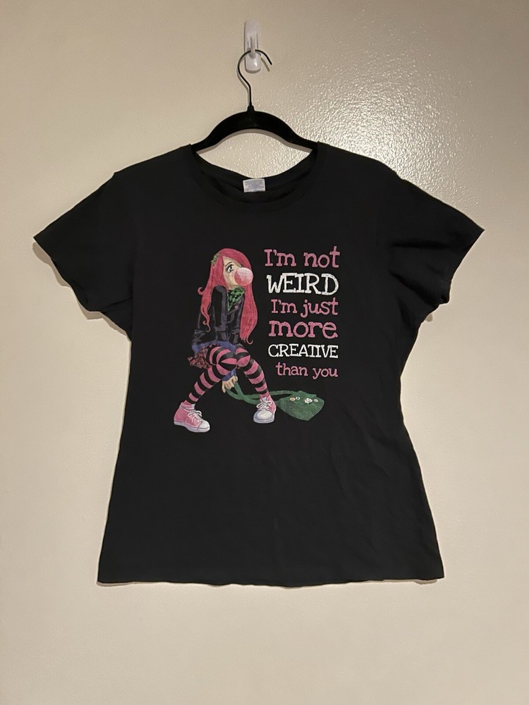 EUC Women’s XL Black Graphic Print Tshirt I’m Not Weird More Creative Than You EUC Women’s XL Black Graphic Tshirt Retro Vintage 90s Bubblegum Sneakers Tights Excellent Used Condition Short sleeves Bust: 20” pit to pit Smoke and pet free home