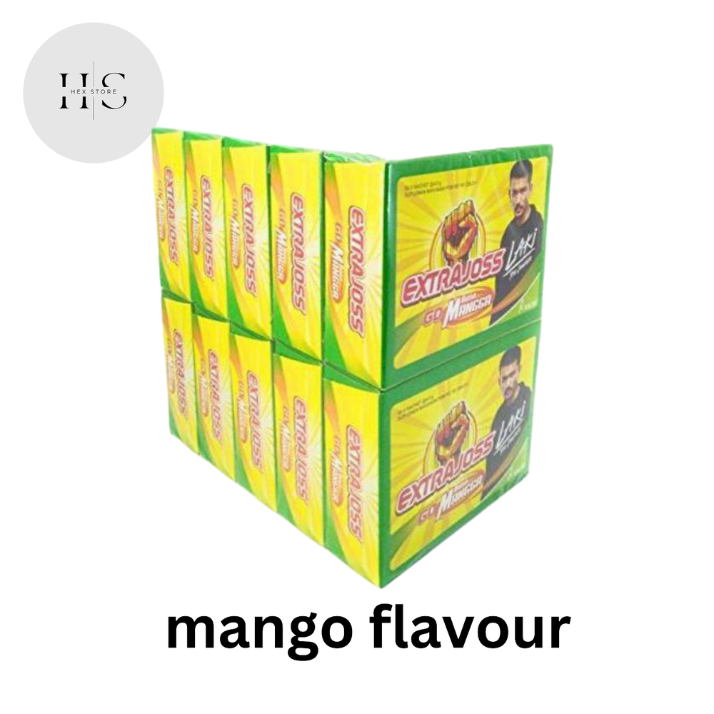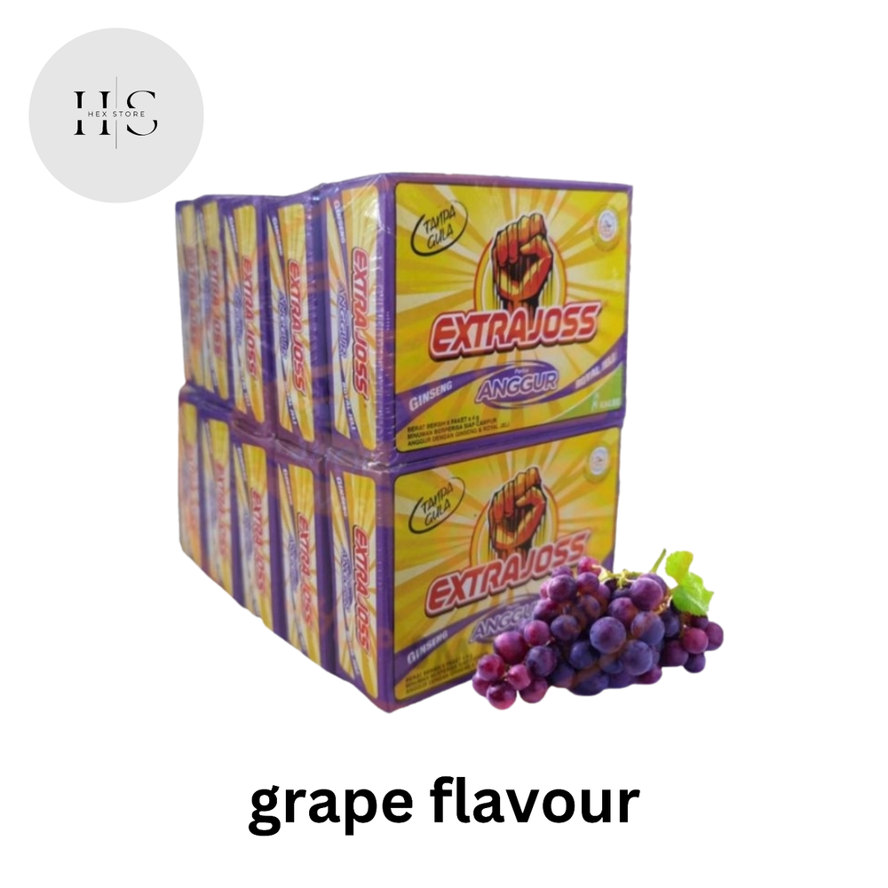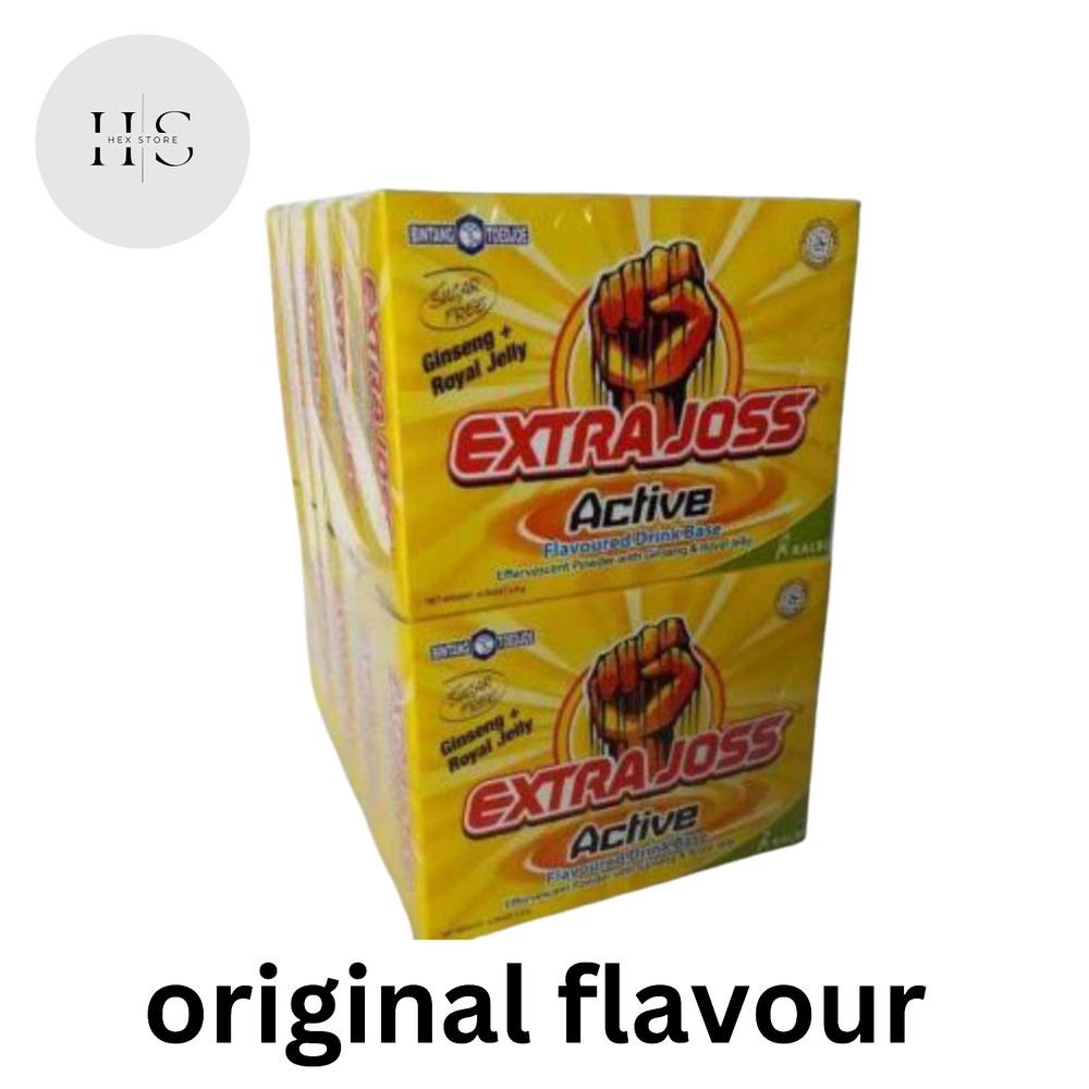Extra Joss is designed for an active lifestyle. The 'Active' ingredients work in synergy to assist metabolism, stimulate confidence, increase physical endurance, and overcome fatigue. Extra Joss is designed for an active lifestyle. It will recharge your working day, and is a brilliant pre-sport or workout power up. The tropical fruit flavour tastes great and is Sugar Free. The 'Active' ingredients work in synergy to assist metabolism, stimulate confidence, increase physical endurance, overcome fatigue, sharpen the senses, enhance reaction speed and for some, it helps lift hangover haze. There are six single serve sachets per pack. Each sachet makes a 200ml effervescent energy drink. Added to a glass or bottle of water, it dissolves rapidly, and is ready to drink in seconds. Dilute to your own taste. It's the real thing Extra Joss is formulated using Ingredients found in other leading RTD energy drinks for less than half their prices and includes the same ingredients like Caffeine, Taurine, Thiamin, Riboflavin, Inositol, Niacin, and other B vitamins. But it is Sugar Free and contains Ginseng and Royal Jelly. Type and Color - Active 6's (Biasa/Yellow/Kuning) GINSENG + ROYAL JELLY - Grape 6's (Purple) - Mango 6's (Yellow Green) DM me to confirm your flavour