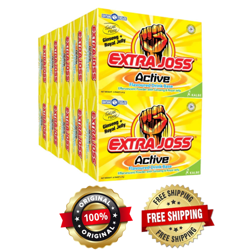 Extra Joss is a refreshment drink that give fruity taste, with additional benefit of Power from Extra Joss endorsement - Boost Body's Immune System - Royal Jelly Helps Enhance Immune System - With Vitamin B6,B9 and B12 Directions - Take and tear 1 sachet of Extra Joss - Pour the powder in to glass - Pour cold water (300 ml) to the glass - The powder will dissolved immediately - Serve it immediately while chilled Ingredients - Compositions:Grape, Mango& Extract 150 mg, Ginseng Extract 35 mg, Vitamin B1 1.5 mg / 1.1 mg, Vitamin B6 2 mg, Vitamin B12 2.4 mcg/2.0 mcg, Taurine 100 mg, Caffeine 50 mg, Sugar, Aspartame, Citric Acid, Royal Jelly Caution - Not advisable for children below 12 years old and pregnant women. Storage Instruction - Store below 30°C Packaging - 10 boxes x (6 Sachets x 5.5 g) Nutritional Information (Per 100g) - Energy: 295 cal - Total Carbohydrate: 69 g - Total Sugar: 0 g - Protein: 4.9 g - Fat: 0.9 g - Vitamin B3: 375 mg - Vitamin B6: 50 mg - Vitamin B12: 60 mcg
