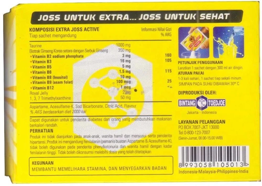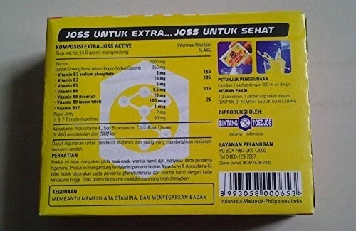 Item description from the seller Description Extra Joss is designed for an active lifestyle. It will recharge your working day, and is a brilliant pre-sport or workout power up. The tropical fruit flavour tastes great and is SUGAR FREE The ‘Active‘ ingredients work in synergy to assist metabolism, stimulate confidence, increase physical endurance, overcome fatigue, sharpen the senses, enhance reaction speed… and for some, it helps lift hangover haze. There are six single serve sachets per pack. Each sachet makes a 300ml effervescent energy drink. Added to a glass or bottle of water, it dissolves rapidly, and is ready to drink in seconds. Dilute to your own taste. It’s the real thing Extra Joss is formulated using Ingredients found in other leading RTD energy drinks and includes: Caffeine, Taurine, Thiamin, Riboflavin, Inositol, Niacin, and other B vitamins. It’s Sugar Free and contains Ginseng and Royal Jelly. 100% Genuine, New and In Stock 1 Box = 6 Sachets 10 Boxes = 60 Sachets Payment Method: We accept payment using eBay manage payment only. Shipping Method: Handling time is 1-3 working days. Your goods will be shipped with a valid tracking number. All products are packed, and layered with bubble wrap to reduce damages during shipment delivery. Economy Shipping : The products will be shipped via SingPost from Malaysia. Estimate delivery is between 11 to 23 business days. Expedited shipping : Approx 9-11 working days depending on location Tracking will be provided. Return Method: If you have any problem with the order, do contact us via eBay message. We are glad to assist you and solving the problem as soon as possible. Items can be returned within 30 days in a good condition. Other: Import duties, taxes, and additional charges are not included in the item price or shipping charges. Please be aware this custom import duties and taxes are buyer's responsibility. Feedback: If you have any problems with your purchase, shipment, return/exchange, or any others, please e-mail us and let us resolve the problem before leaving us a negative feedback or low DSR scores. Our customer service support team is here to ensure that you are satisfied with our services. Negative feedback is last option, kindly contact us to solve any issues.