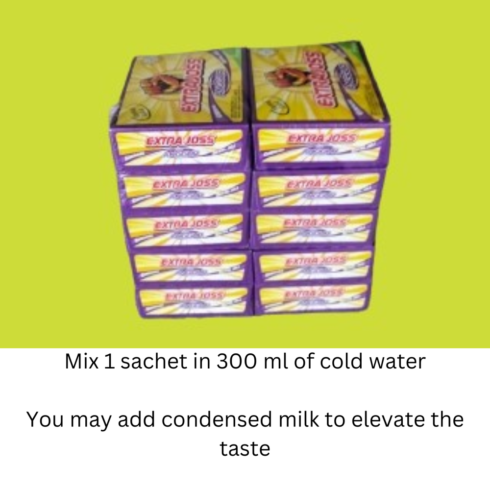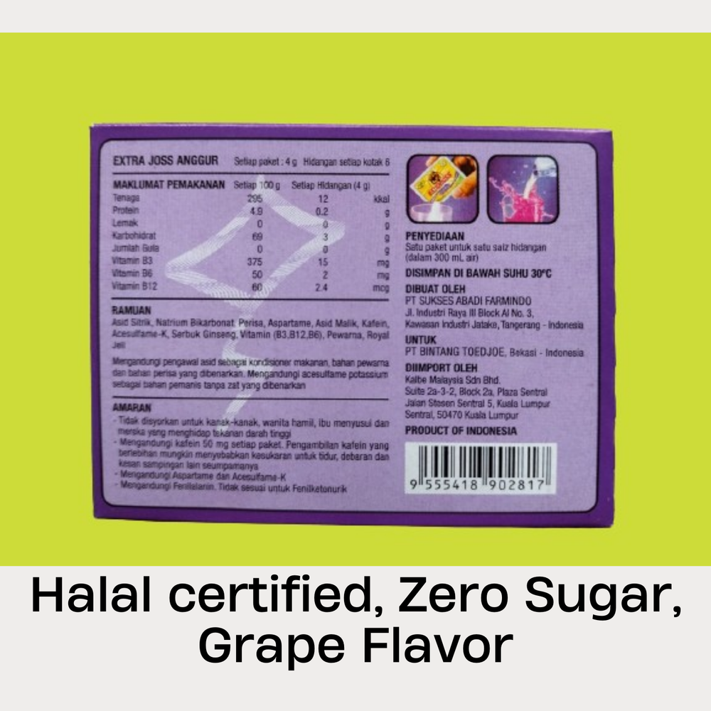 Enjoy the delicious and refreshing taste of EXTRA JOSS, a Halal-certified instant drink with grape flavor, ginseng, and royal jelly. This Indonesian-made product comes in 10 boxes, each containing 6 sachets, for a total of 60 servings. With only 12 calories per serving and 295 calories per 100g, it's a guilt-free indulgence that gives you a boost of energy. Perfect for those who love non-alcoholic drinks, EXTRA JOSS is a must-have pantry item that guarantees satisfaction with every sip. Its expiration date is in August 2025, so you have plenty of time to stock up and enjoy. Order now and experience the goodness of EXTRA JOSS!