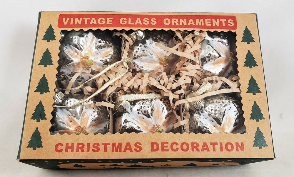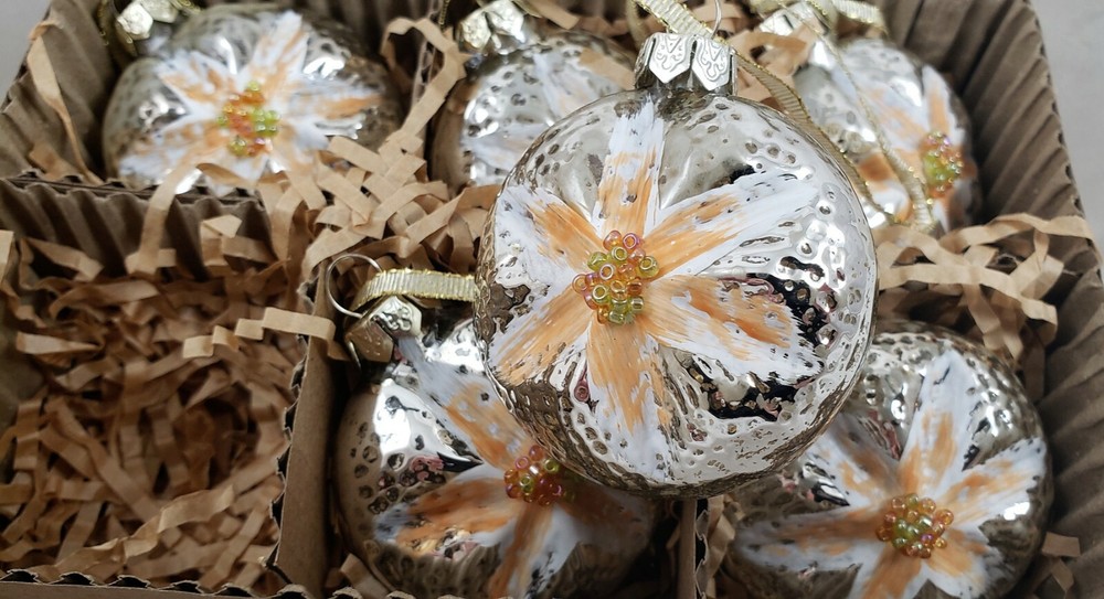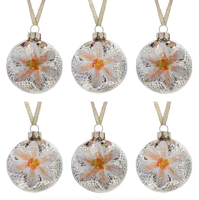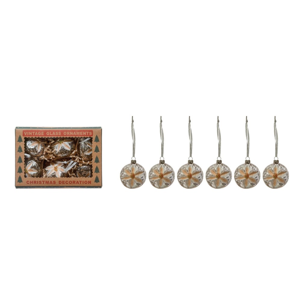 Flower Round Glass Ornaments These vintage inspired round glass ornaments are embellished with peach color and white painted flower petals with tiny beads in the center. Set of 6 glass ornaments, they are 2" and packaged in a keepsake box. New great for all holidays, including Easter, Spring and Christmas