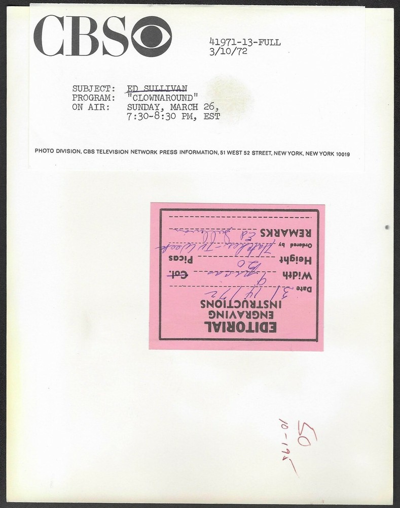 ~ Ed Sullivan Original 1972 CBS TV Promo Photo Clown Costume 79951 Item Original TV Network Promo Photo/Still(s) Featured Ed Sullivan Title Clownaround Issued by CBS Year Printed/Issued 1972 Photo Stock glossy Size 7x9 (inches) ~ television promo photos of this era were usually issued at this size (inches) Condition excellent ~ As a picture is worth a thousand words, please use the "zoom" feature to see the condition of the photo in detail. The photo shown is the exact photo you will receive. Nearly all of the photos offered by Starlight were used for publication, giving them added value, significance and validity. Notes ~ original CBS logo caption sheet on back of photo along with publication spec sheet Guarantee This is the real thing—a rare, original promotional photo. "Original" means this is the actual item that was printed in the year cited above and distributed by a movie studio, television network or agency to theaters and the media for promotion. It is not a reprint. Most of our photos are so rare that you may rarely if ever see them on eBay again. Promo photos are limited editions as only a small number were printed to promote the artist or production. To be truly collectible a photo must be an original. We sell only original photos. In addition to their value as collectibles and investments, original photos make unique gifts which can be tailored to a specific interest. They also make great wall décor for your home, office or media room. Buy and bid with confidence! Starlight Collectibles is one of the premier sources for vintage movie memorabilia. When you buy from us you can be assured that you are buying a genuine, professionally authenticated, original still photo. We have over 30 years of experience authenticating entertainment memorabilia and review each item to make sure it is an original. Photos are guaranteed authentic for the life of the photo. As collectors ourselves we understand the importance of receiving an item promptly, in the condition stated and securely packaged. We stand behind our products and service 100%, and offer an unconditional money-back return policy on our items. We combine shipping on items purchased within a 14-day period. Please check our other auction and store items. Thanks for your business and come back often. Own a Rare Piece of Hollywood History! Original Vintage Movie, Music and TV Memorabilia Authenticity Guaranteed for the Life of the Item We Combine Shipping
