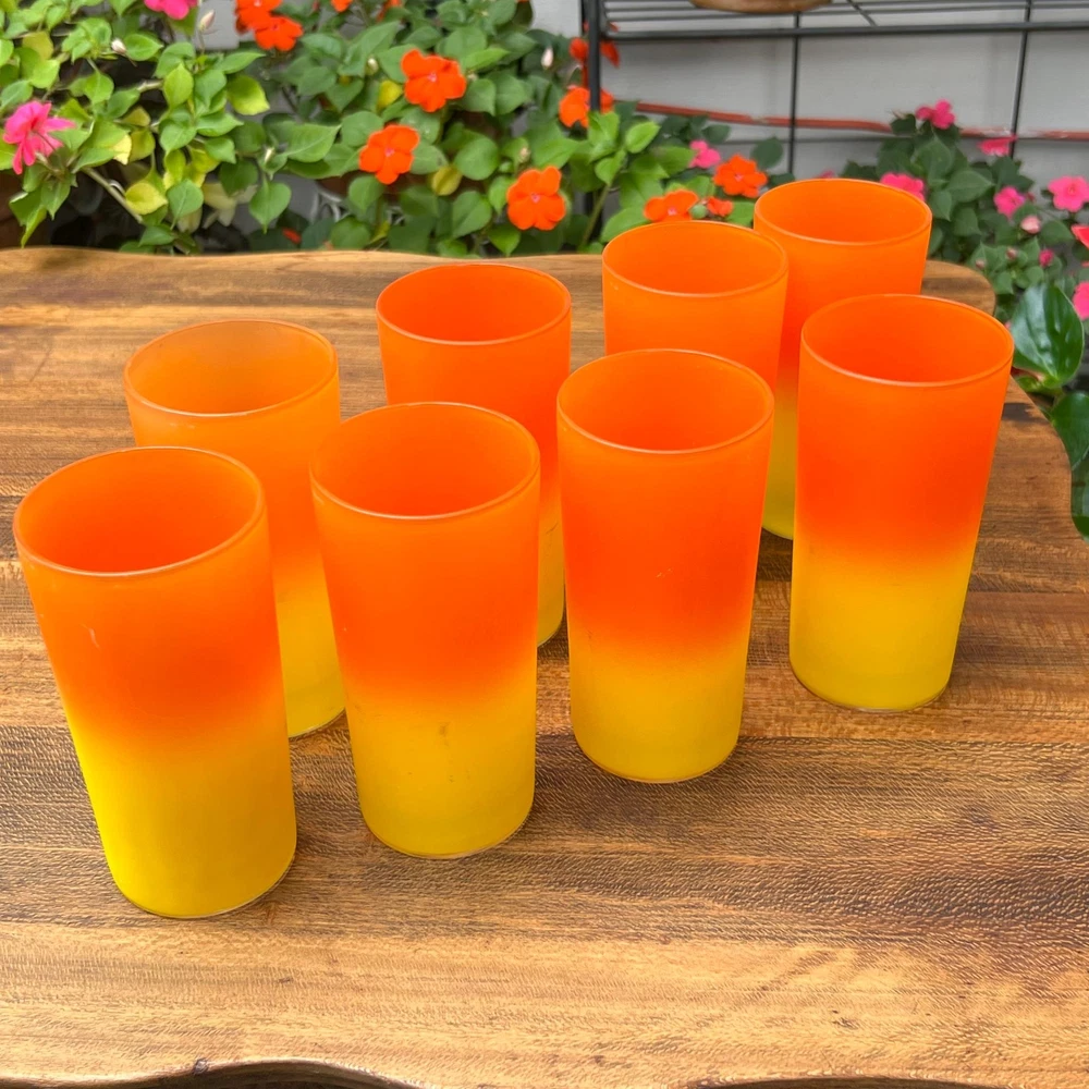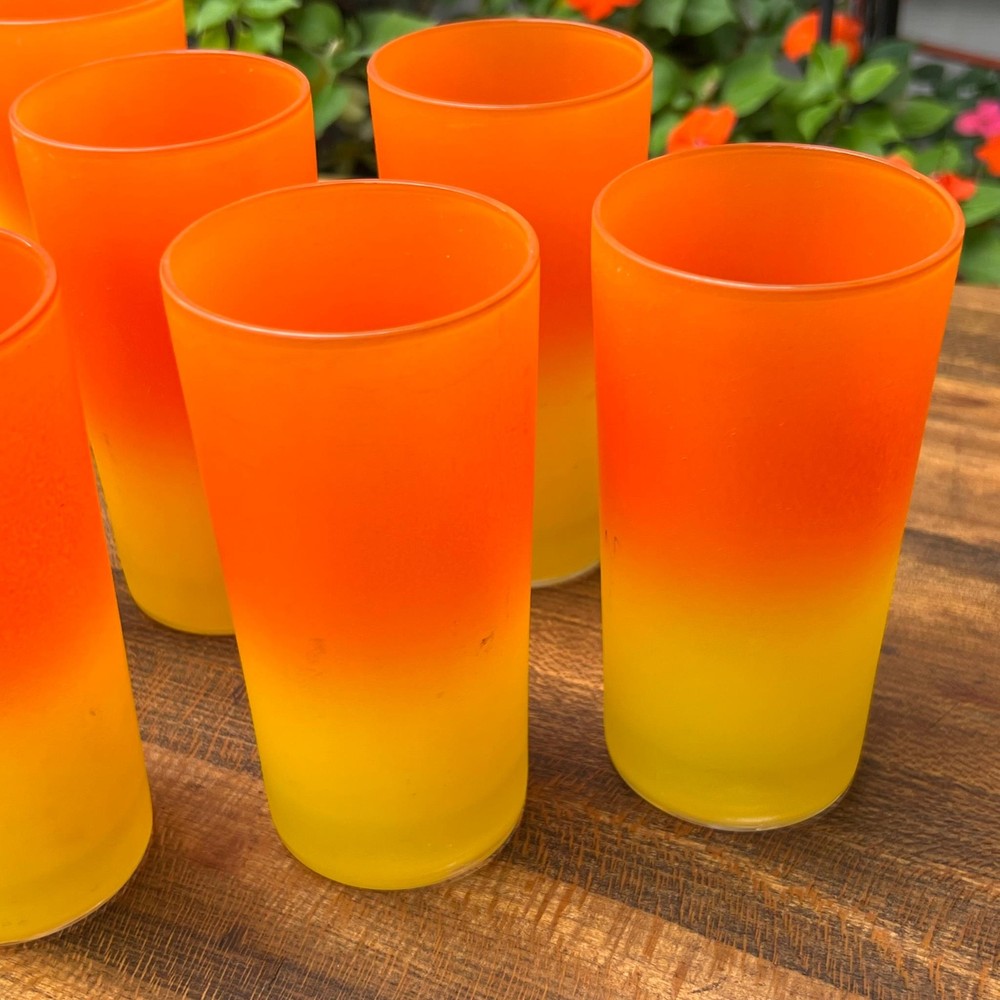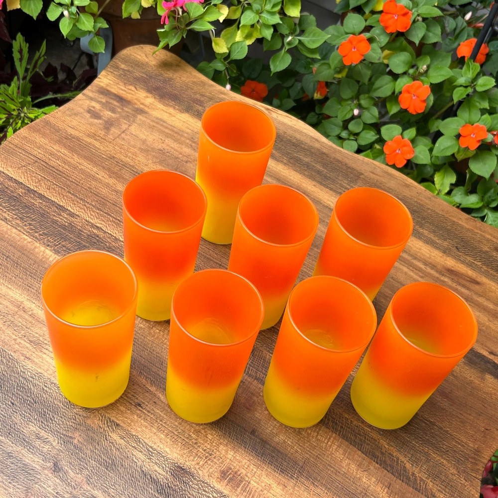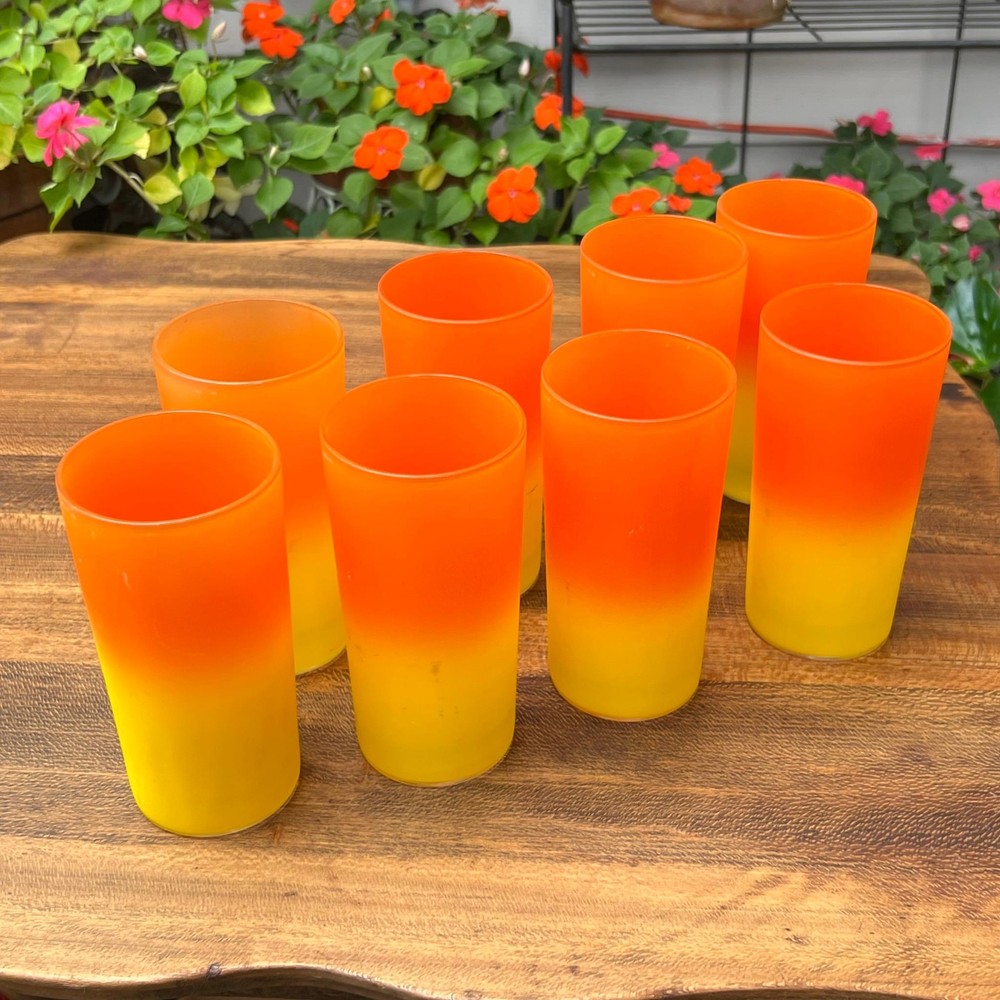 Eight Mid-Century Modern candy corn beverage glasses, measuring approx. 2-3/4" wide at the opening and 5-1/2" high, boast a textured exterior to make gripping more comfortable. Eight glasses in total, with some minor scratches and scrapes, including one with a slightly more textured side - see pictures and double-check the measurements to ensure satisfaction. Listing and template services provided by inkFrog