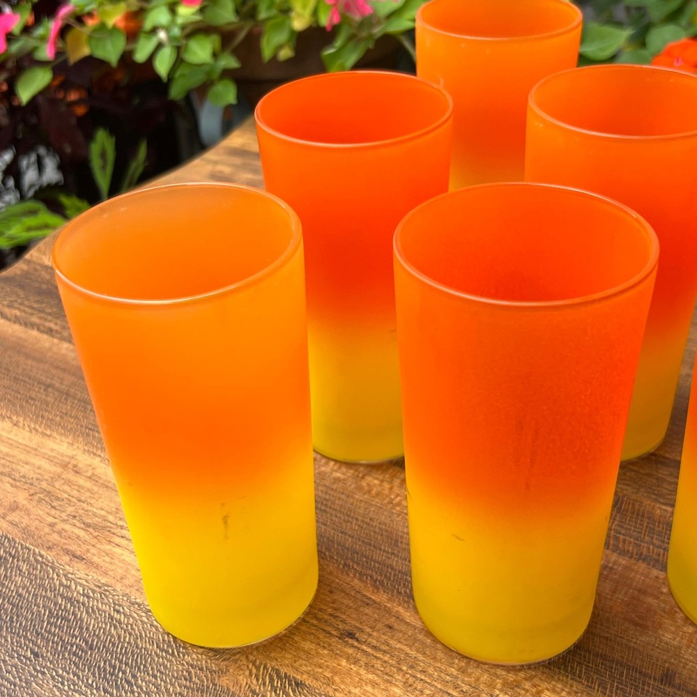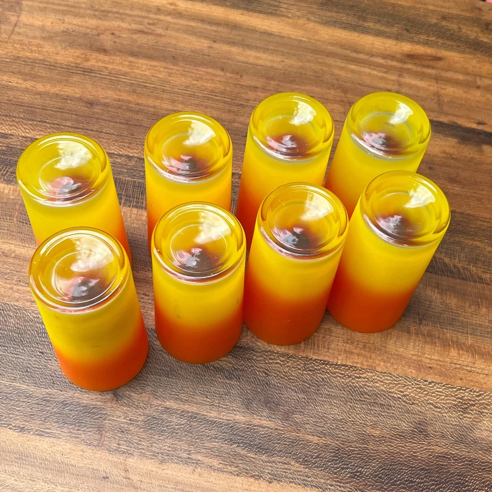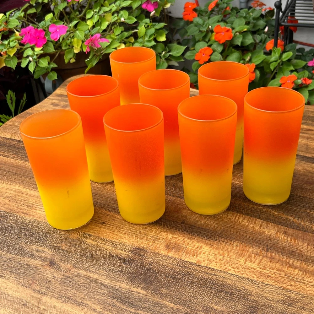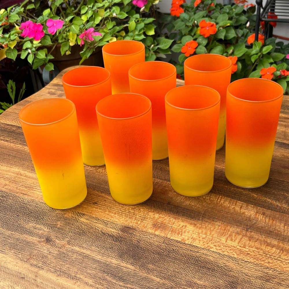 Eight Mid-Century Modern candy corn beverage glasses, measuring approx. 2-3/4" wide at the opening and 5-1/2" high, boast a textured exterior to make gripping more comfortable. Eight glasses in total, with some minor scratches and scrapes, including one with a slightly more textured side - see pictures and double-check the measurements to ensure satisfaction. Listing and template services provided by inkFrog