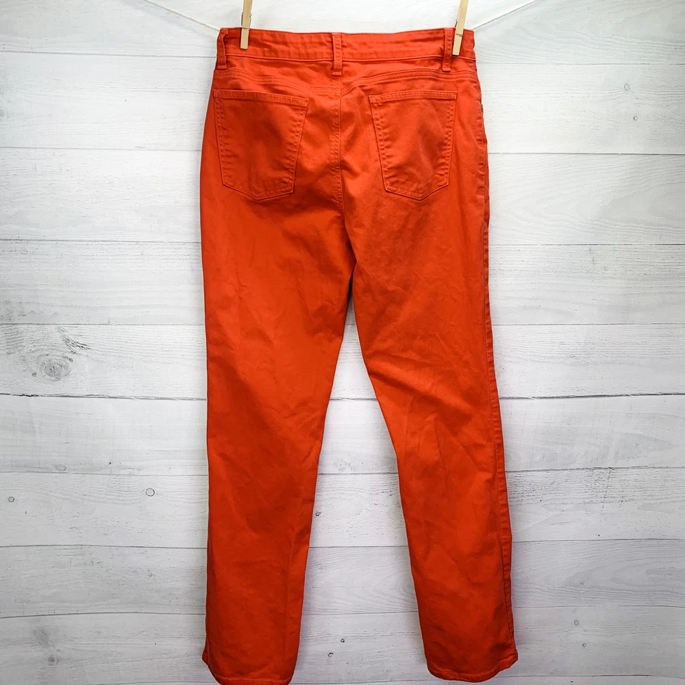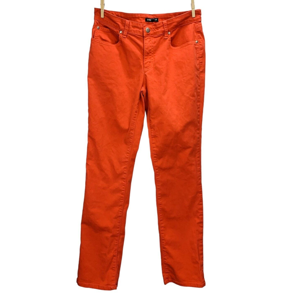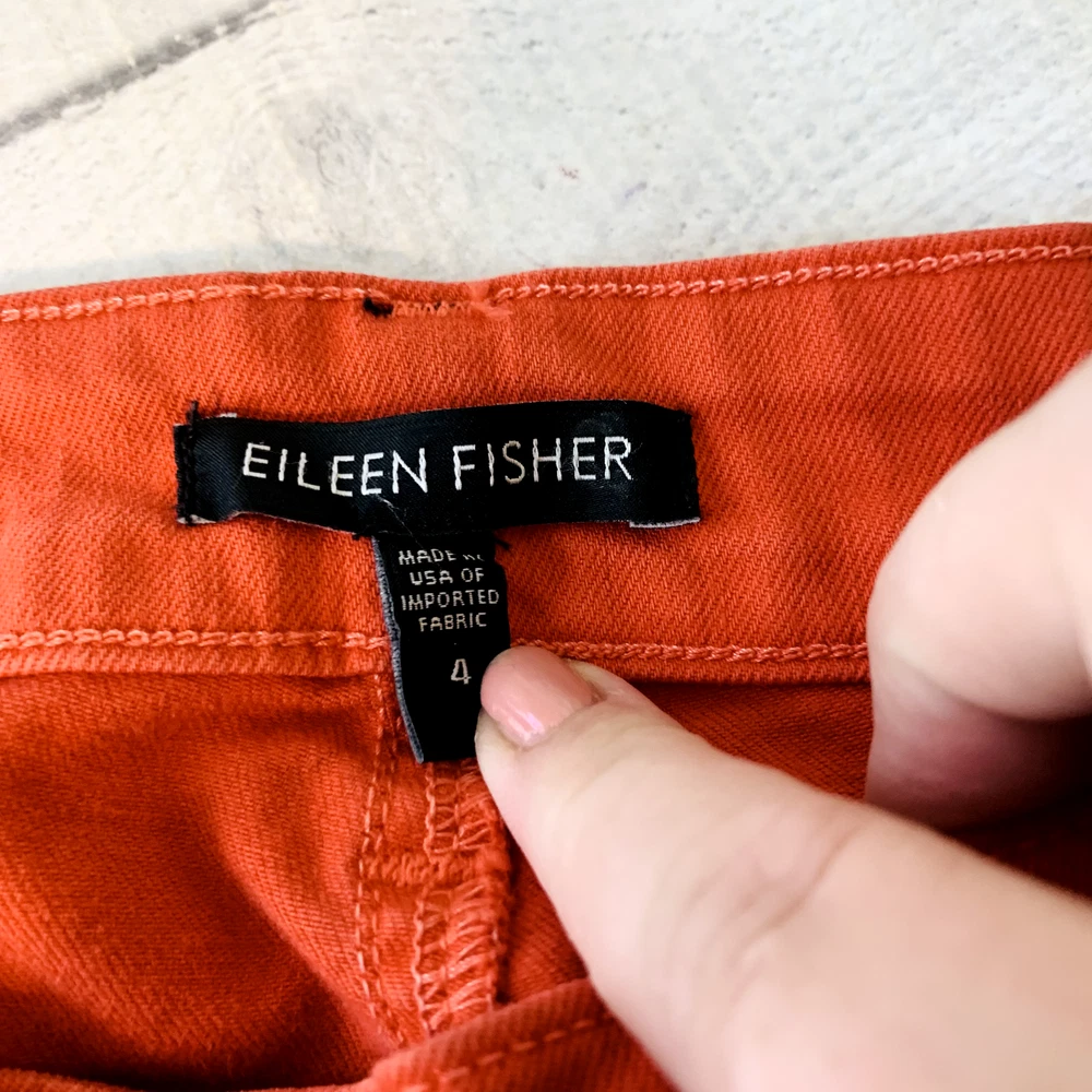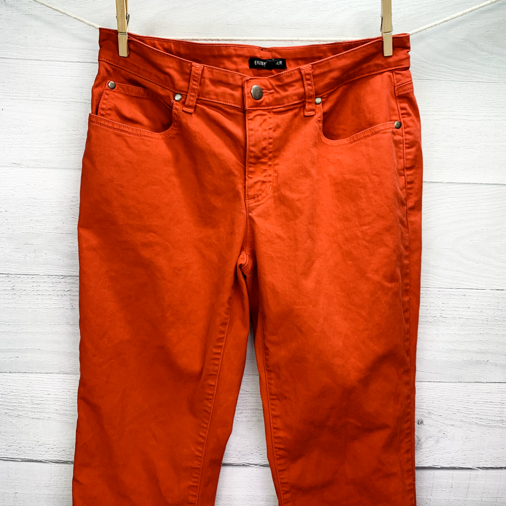 Thanks For Shopping At Bean's Bargain Shop! Brand : Eileen FIsher Condition : VGUC; Faint 1/2" mark on the backside of the leg. No unintentional rips, tears, or holes. Please see photos for best representation of overall condition, as well as flat lay measurements. Label Size : 4 Color : Reddish orange Material : 98% Organic Cotton 2% Spandex Features : Garment Length: Full Closure Style: Zipper fly with button closure Rise: Mid Fit: Slim fit with a tapered leg Pockets: 5 Stretch: Yes Care and Cleaning: Machine washable *All measurements are approximate. If you have questions regarding how we measure, we are happy to answer them prior to purchase. There is no standard sizing throughout the clothing industry. Tag size may not reflect every buyer's idea of how a particular size should fit. Use & care may also affect garment fit. We recommend reviewing measurements prior to purchase. Shipping We Ship Our Items Quickly. If Payment Is Made Prior To 1PM Central Standard Time On Regular Business Days, The Item Will Typically Ship Same Day. Otherwise Shipment Will Occur On The Next Business Day. Multiple shipping options are provided for most items, available at checkout. Inventory Location: 13860-40-LP 16 oz | +$0M | F SP