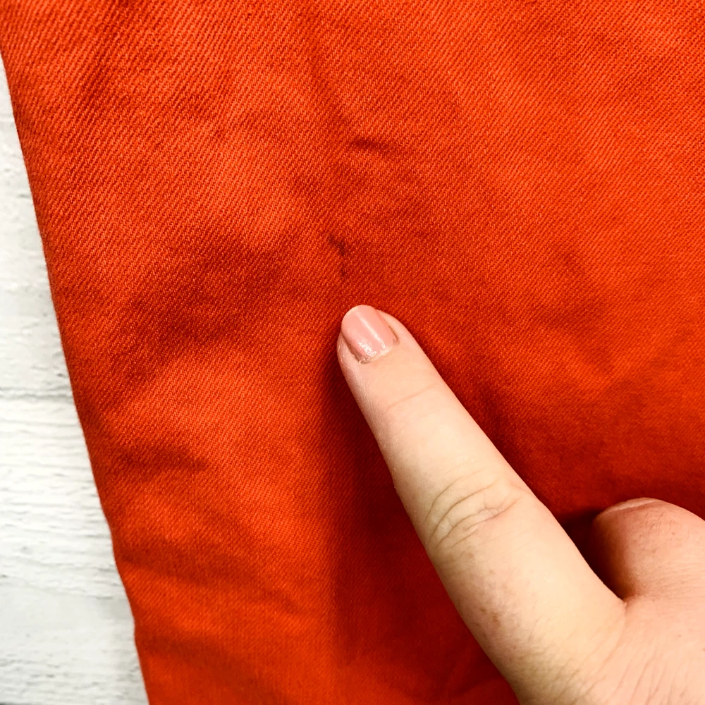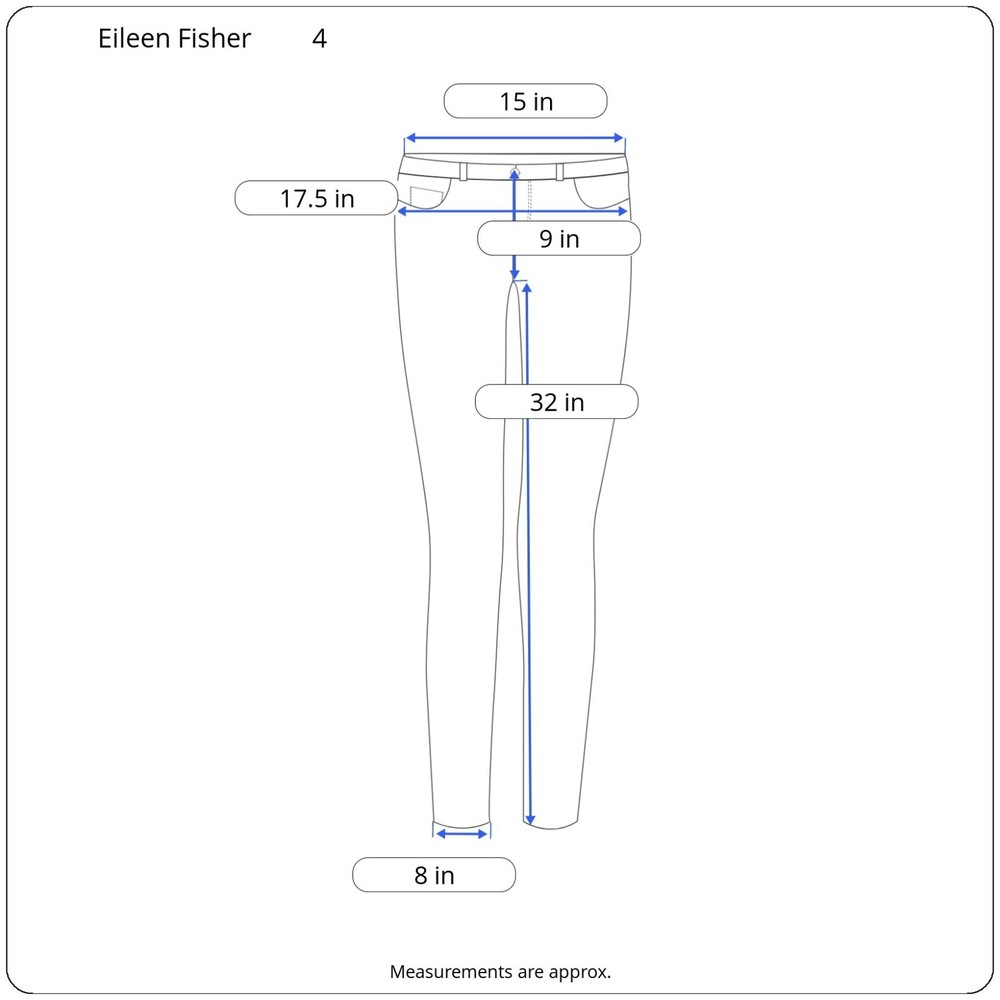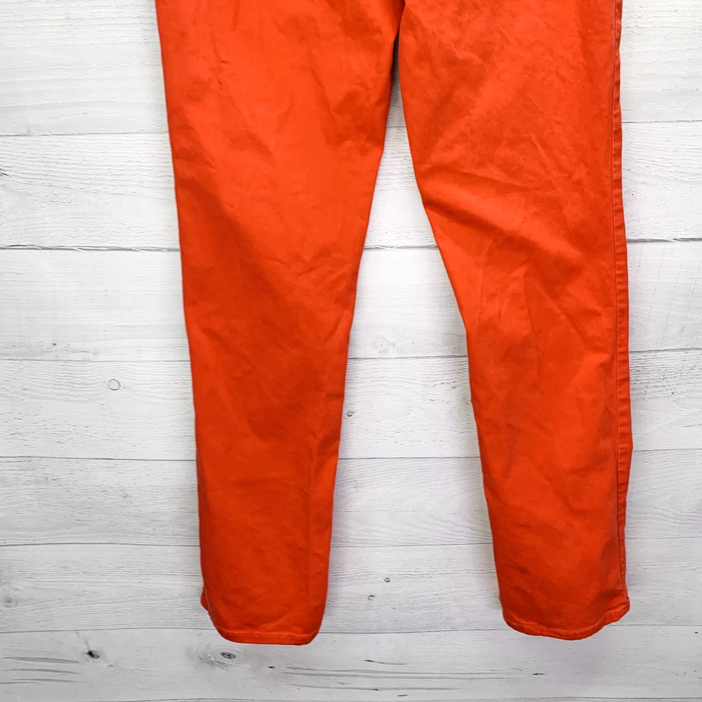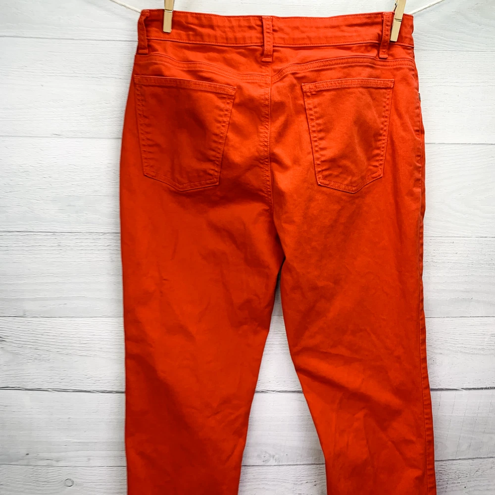 Thanks For Shopping At Bean's Bargain Shop! Brand : Eileen FIsher Condition : VGUC; Faint 1/2" mark on the backside of the leg. No unintentional rips, tears, or holes. Please see photos for best representation of overall condition, as well as flat lay measurements. Label Size : 4 Color : Reddish orange Material : 98% Organic Cotton 2% Spandex Features : Garment Length: Full Closure Style: Zipper fly with button closure Rise: Mid Fit: Slim fit with a tapered leg Pockets: 5 Stretch: Yes Care and Cleaning: Machine washable *All measurements are approximate. If you have questions regarding how we measure, we are happy to answer them prior to purchase. There is no standard sizing throughout the clothing industry. Tag size may not reflect every buyer's idea of how a particular size should fit. Use & care may also affect garment fit. We recommend reviewing measurements prior to purchase. Shipping We Ship Our Items Quickly. If Payment Is Made Prior To 1PM Central Standard Time On Regular Business Days, The Item Will Typically Ship Same Day. Otherwise Shipment Will Occur On The Next Business Day. Multiple shipping options are provided for most items, available at checkout. Inventory Location: 13860-40-LP 16 oz | +$0M | F SP