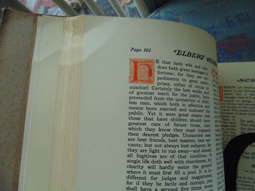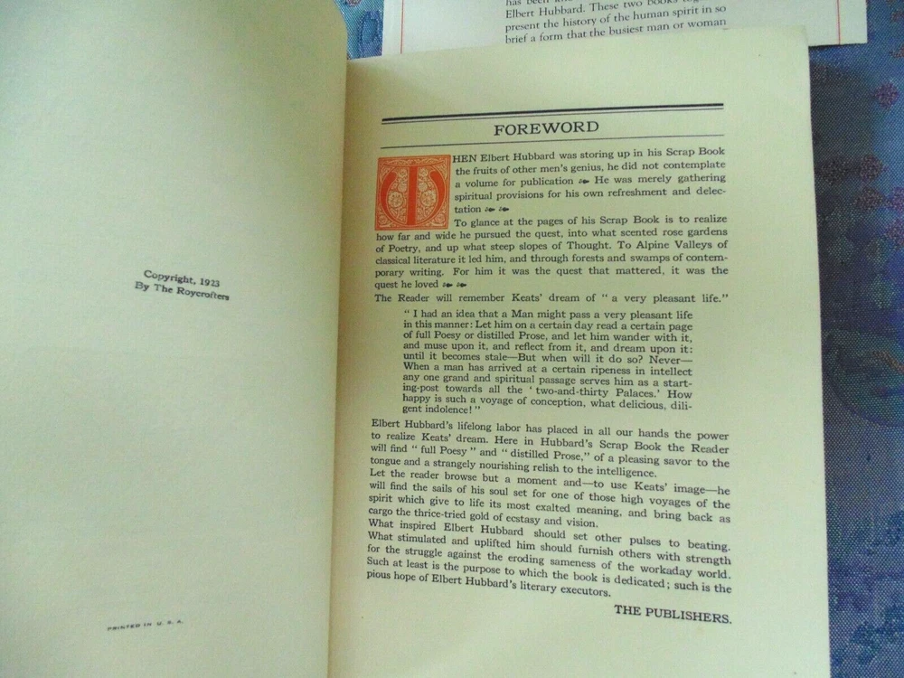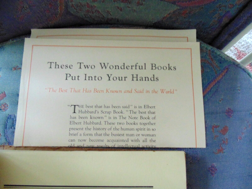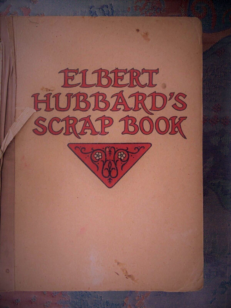 Elbert Hubbard's Scrap Book (1923). Published by Wm. H. Wise & Co. Publishers. with original leaflet. Guidebook for a fulfilling life. The book has a unique binding which is in good condition. There are no marks inside the book. The cover has minor blemishes. The book is in good condition.