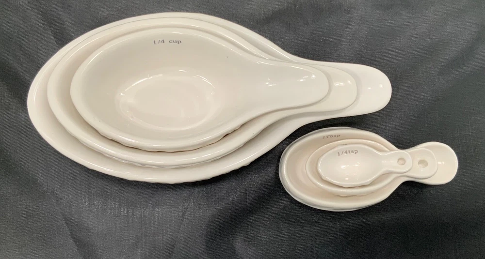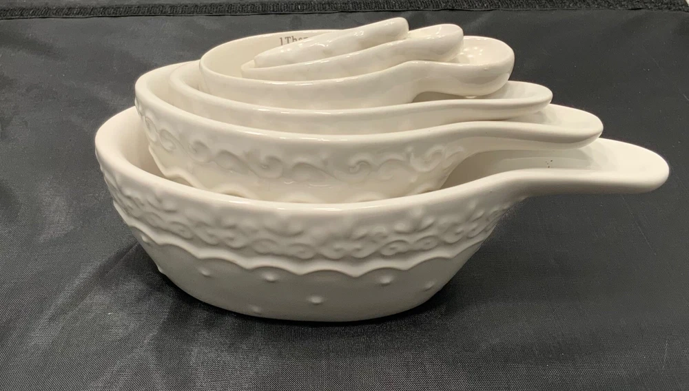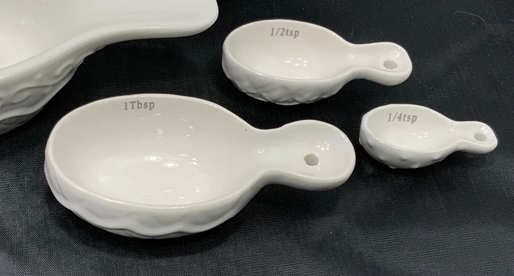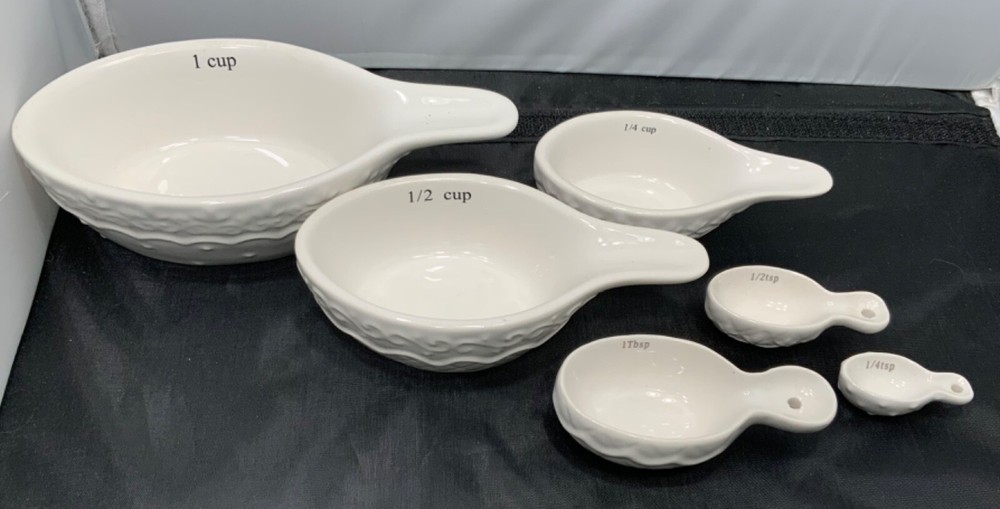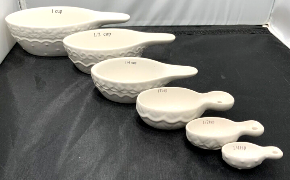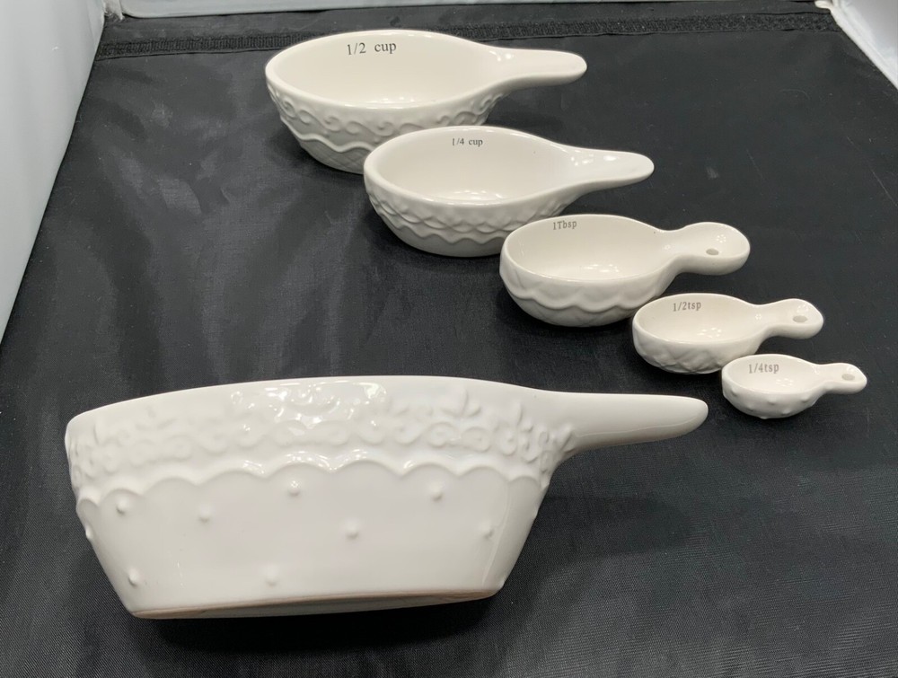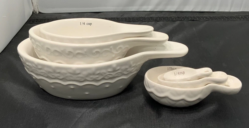 Embossed Ceramic Stacking MEASURING CUPS & SPOONS White Creative Co-op RARE MEASURING CUPS: 1 CUP, 1/2 CUP, 1/4 CUP MEASURING SPOONS: 1 TBSP, 1/2 TSP, 1/4 TSP NESTING CUPS PREVIOUSLY OWNED THEY ARE IN EXCELLENT CONDITION. PLEASE VIEW ALL PHOTOS CAREFULLY BEFORE BIDDING OR BUYING. THEY ARE CONSIDERED PART OF THE DESCRIPTION. THANK YOU FOR YOUR CONSIDERATION! :