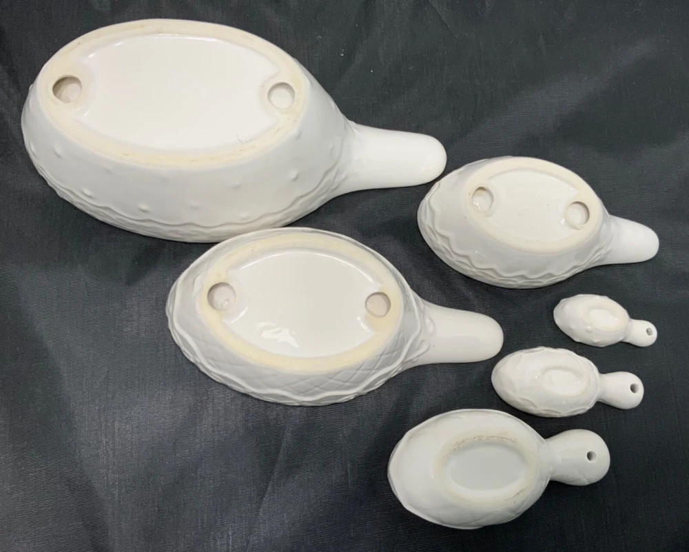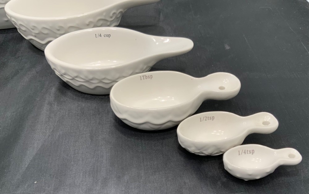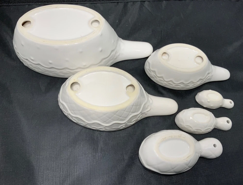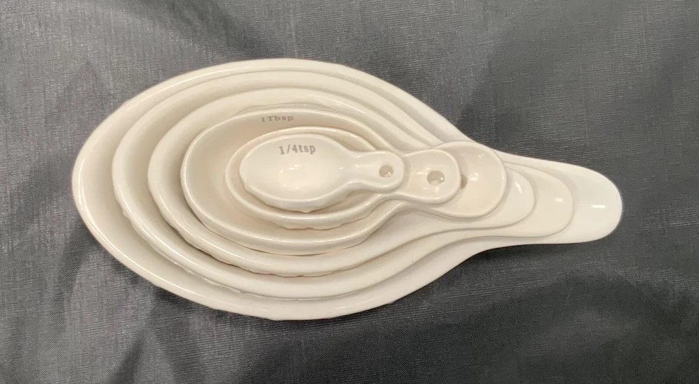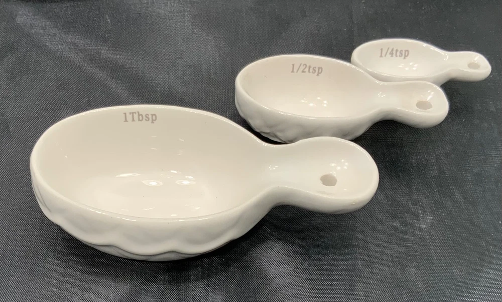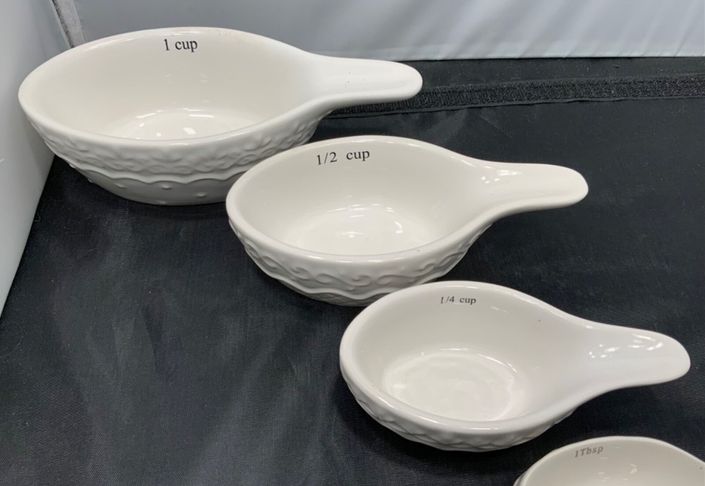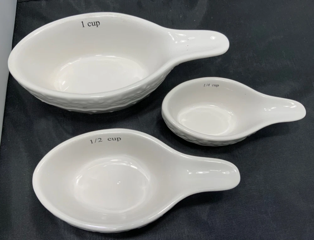Embossed Ceramic Stacking MEASURING CUPS & SPOONS White Creative Co-op RARE MEASURING CUPS: 1 CUP, 1/2 CUP, 1/4 CUP MEASURING SPOONS: 1 TBSP, 1/2 TSP, 1/4 TSP NESTING CUPS PREVIOUSLY OWNED THEY ARE IN EXCELLENT CONDITION. PLEASE VIEW ALL PHOTOS CAREFULLY BEFORE BIDDING OR BUYING. THEY ARE CONSIDERED PART OF THE DESCRIPTION. THANK YOU FOR YOUR CONSIDERATION! :