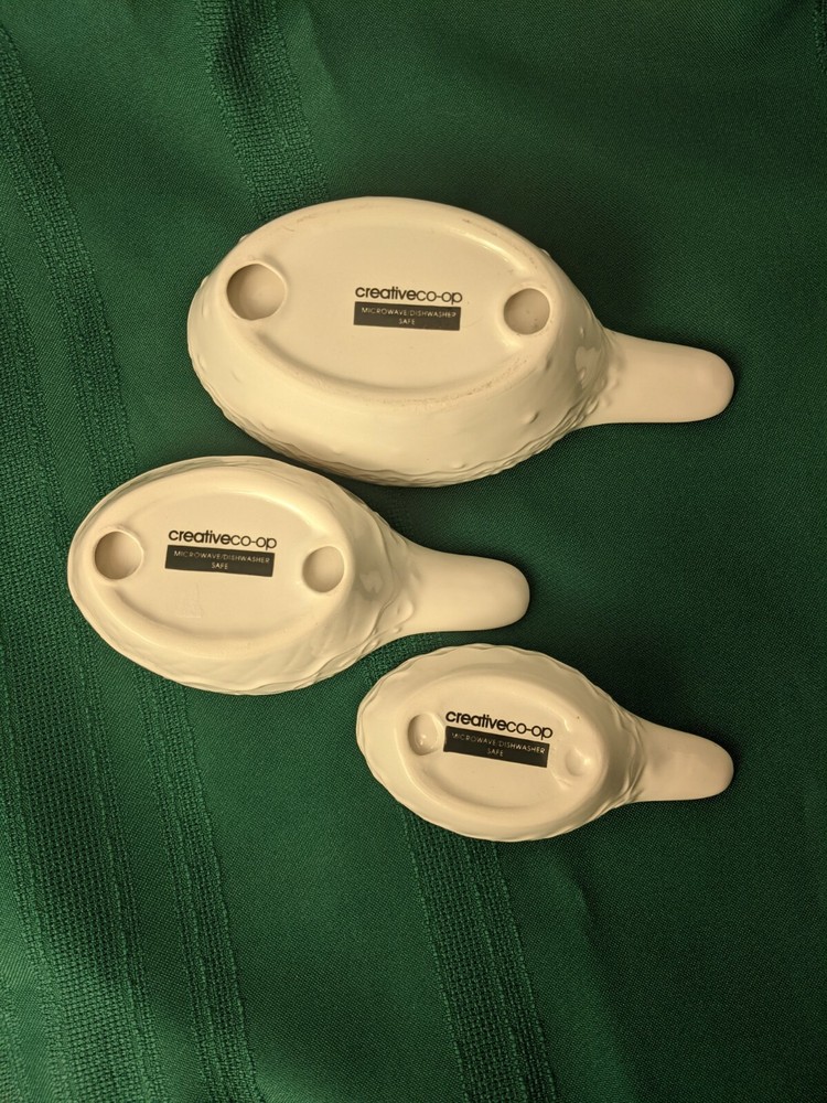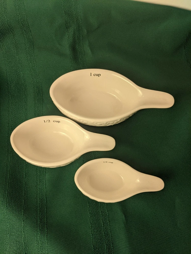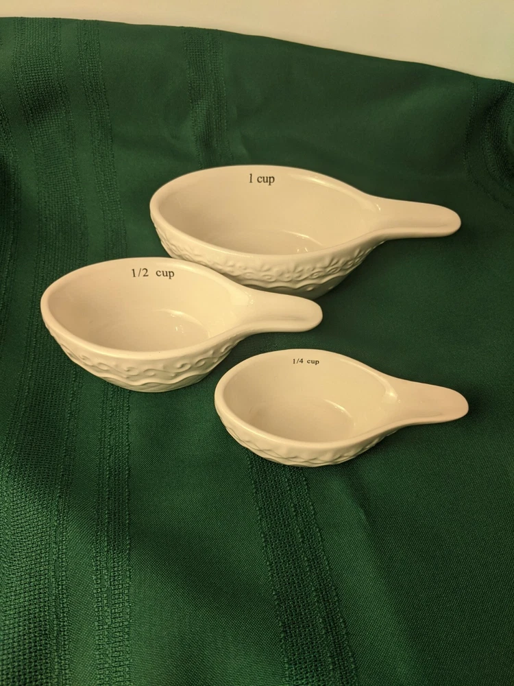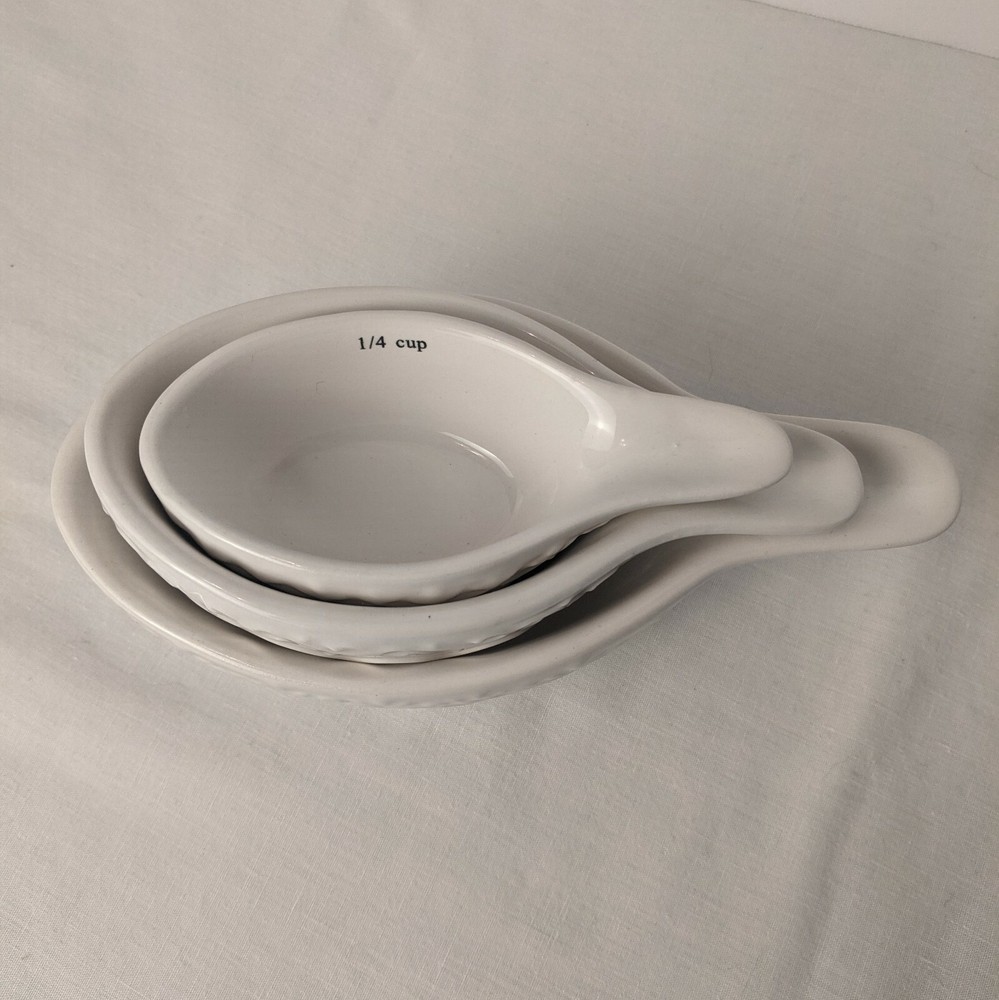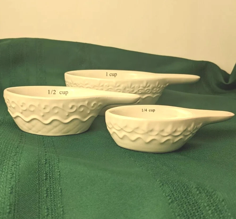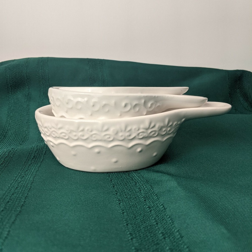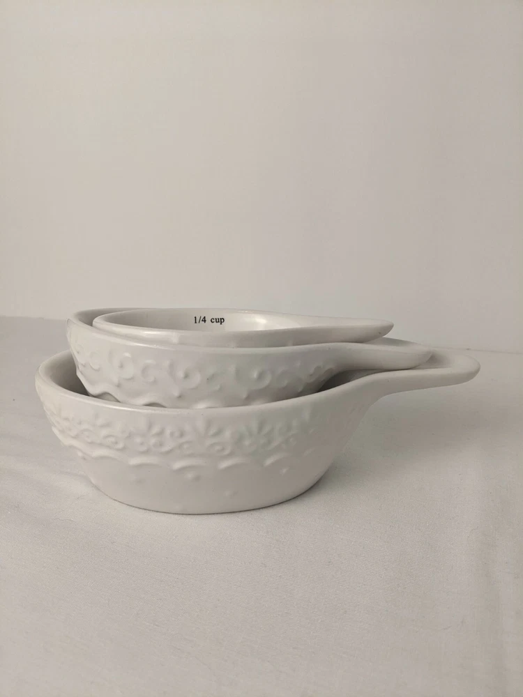 Creative Co-op White Filagree Embossed Design Stacking Ceramic Stoneware Measuring Cups Sizes:1/4, 1/2 & 1 cup. Microwave and Dishwasher safe. Very Good Pre-owned Condition. Ships USPS Priority Mail.