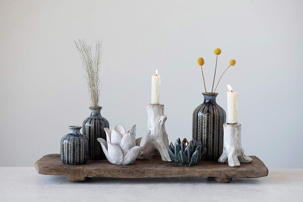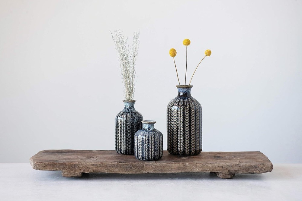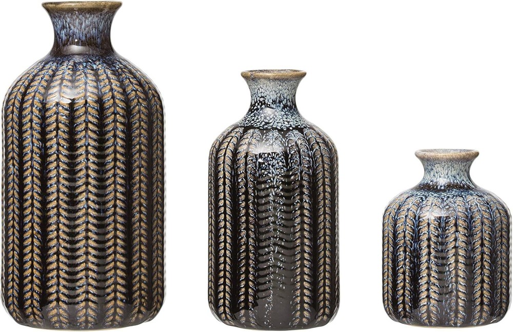 Creative Co-Op Embossed Stoneware Reactive Glaze Finish (Set of 3 Sizes) Vase Set, Blue Item Description These stunning vases will make great decorative accents without the addition of botanicals Narrow openings will gently hold your delicate flowers Small: 2. 75"L x 2. 75"W x 3. 75"H Medium: 2. 75"L x 2. 75"W x 5. 75"H Large: 3. 5"L x 3. 5"W x 7. 25"H › See more product details This elegant trio of stoneware vases features an interesting striped pattern. Their varying heights create a splendid setting when they are lined up next to each other. To accent a shelving unit, place each on a different level with one on the right, one on the left and one in the middle. Payment fast and free shipping Shipping safe payment via ebay . Return 30 Day's returns