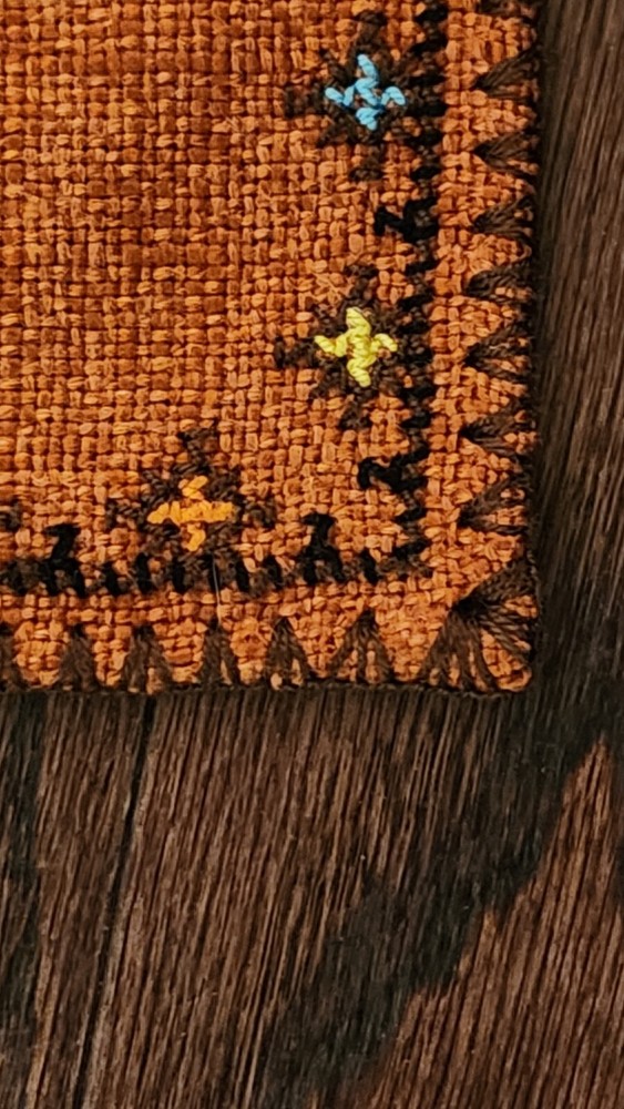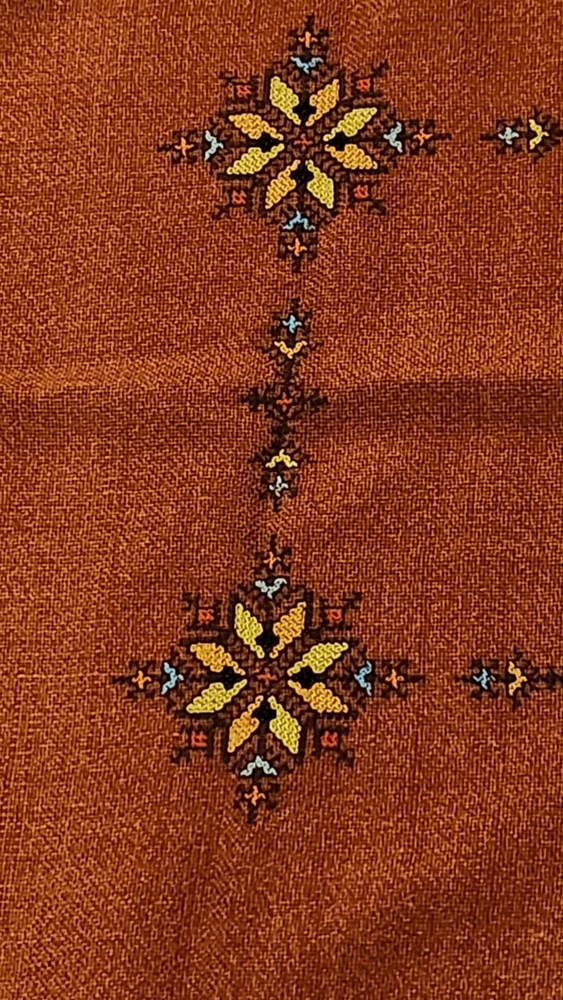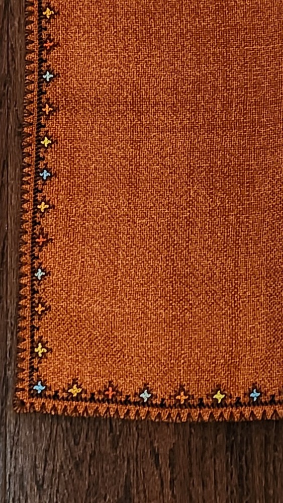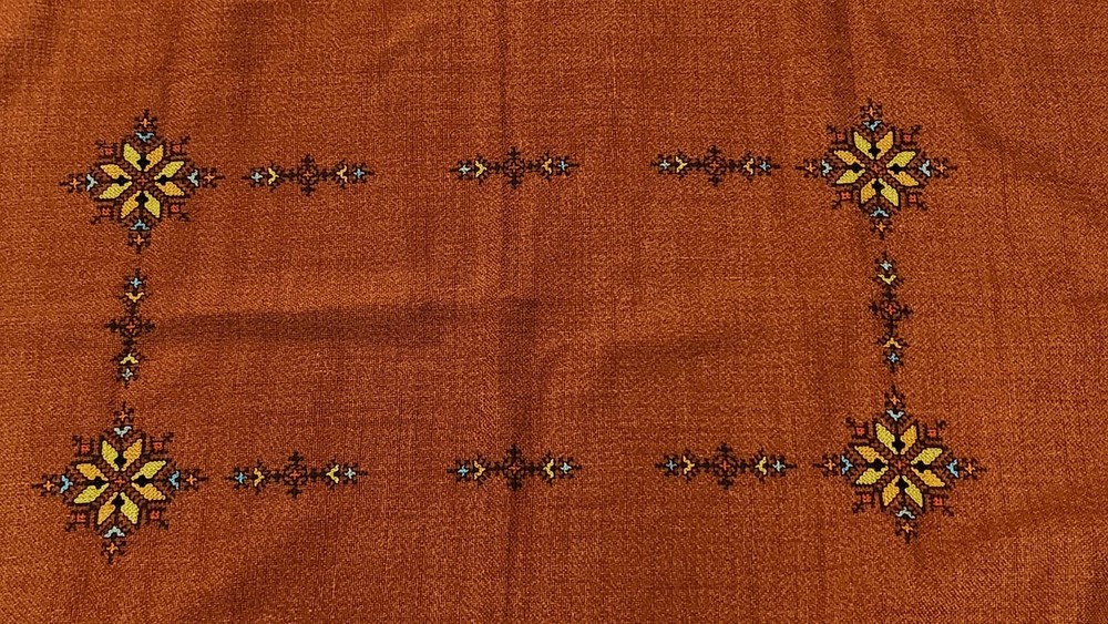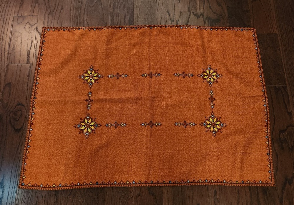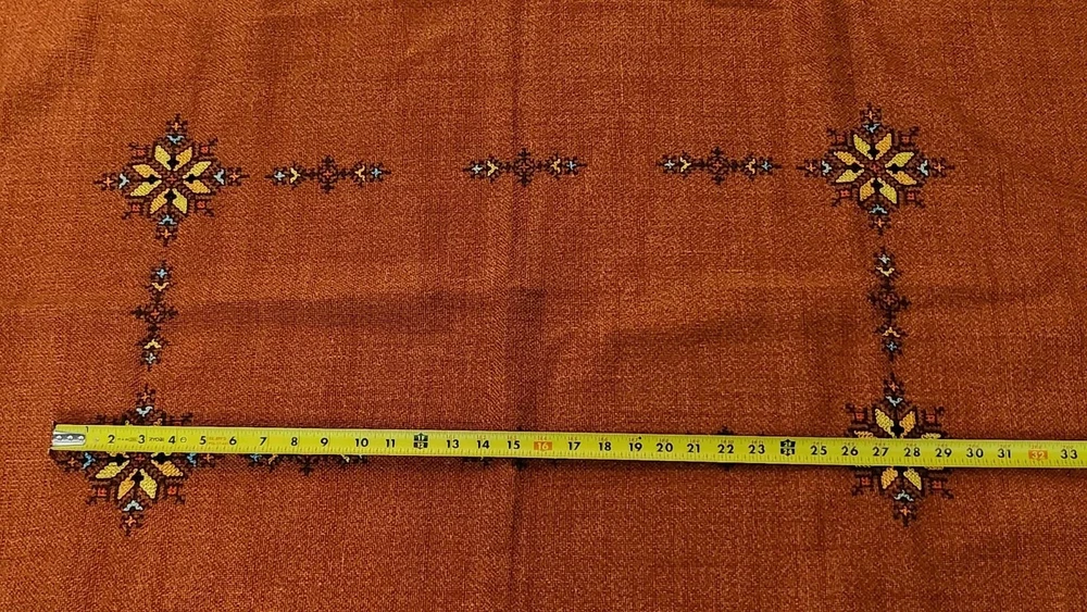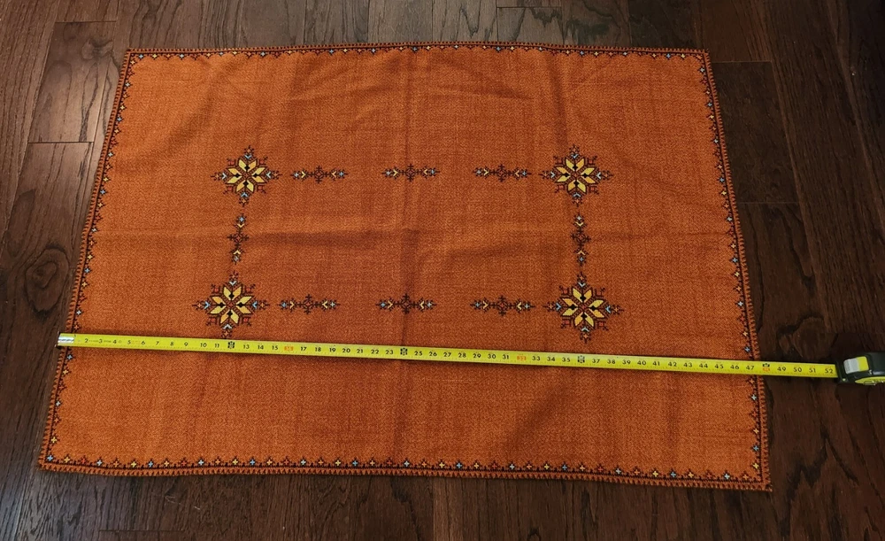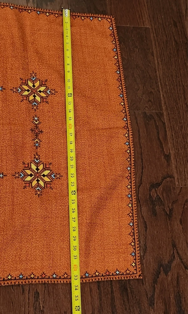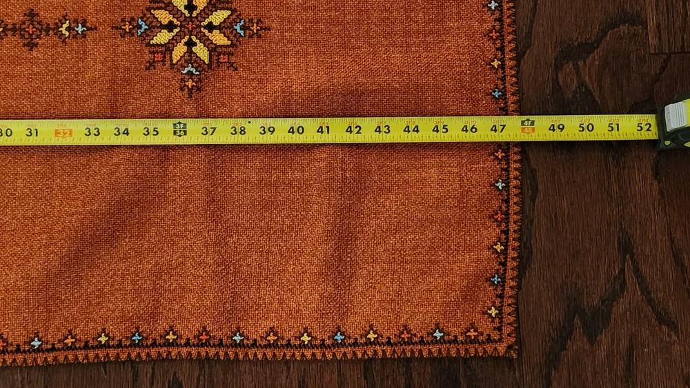 Add a touch of elegance to your dining table with this beautiful embroidered table cover. The warm burnt orange color and mid-eastern design make it perfect for all occasions. The square shape and size of 47.5 inches length and 33.5 inches width make it suitable for most tables. The fabric has a thick woven texture pattern. Crafted from a blend of linen, cotton, and cotton blend, the table cover is both durable and easy to clean. The intricate floral pattern and embroidered features add a touch of sophistication to your decor. Perfect for collectors or anyone looking to add a touch of style to their home, this table cover is a must-have.