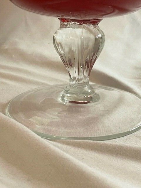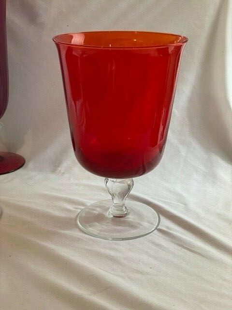 This listing is for a very pretty Empoli style vase. The outside of the glass is red and the inside is orange. It has a clear glass base and stem. No damage or repairs. Measures 10" tall and 6-3/4" wide across the top. There is a small factory flaw on the rim- a bump. There is a small line in the glass that looks like an air bubble