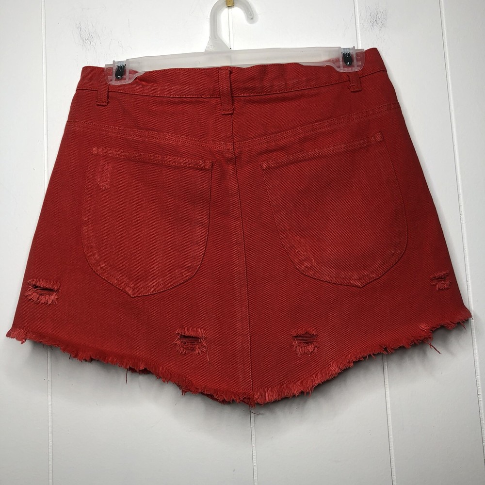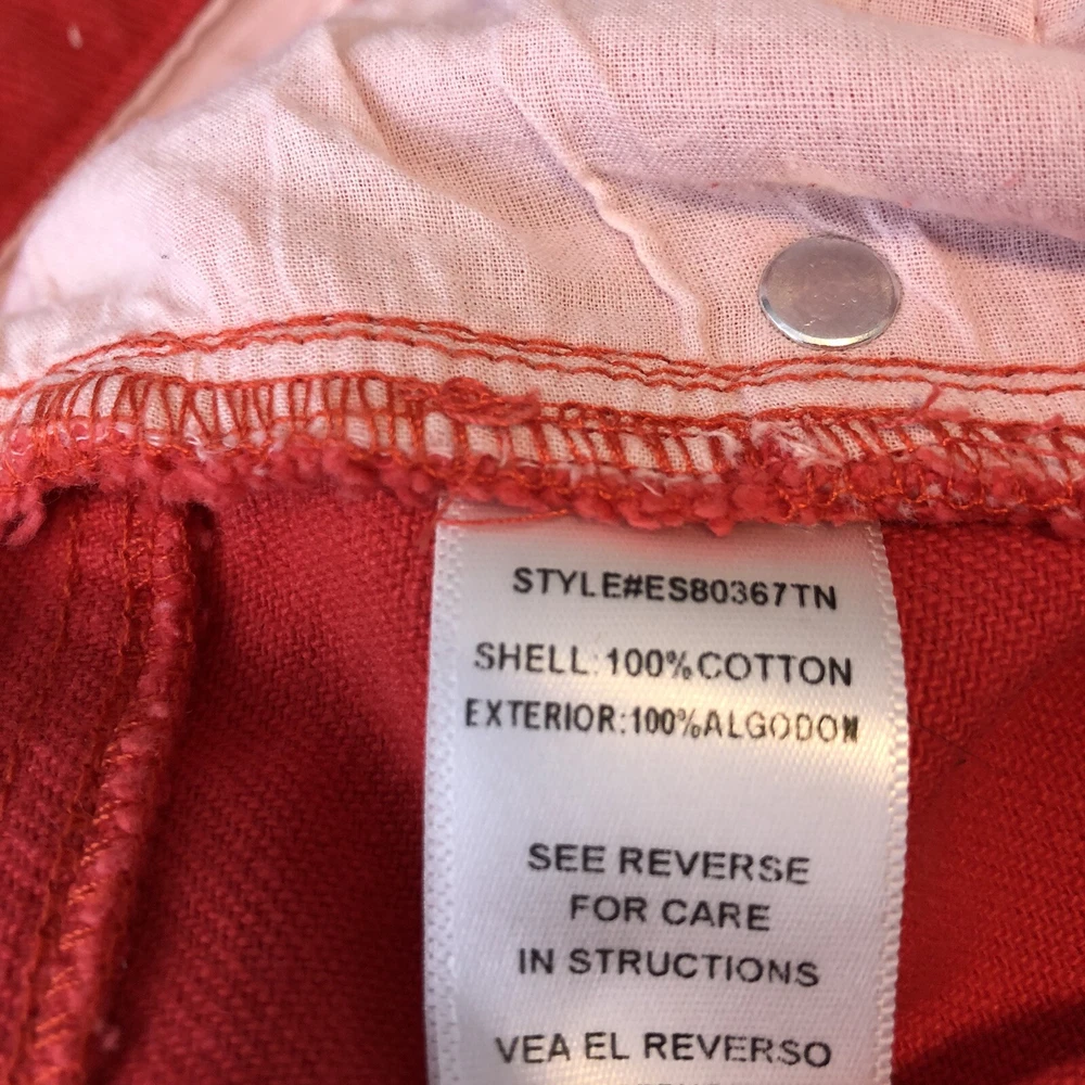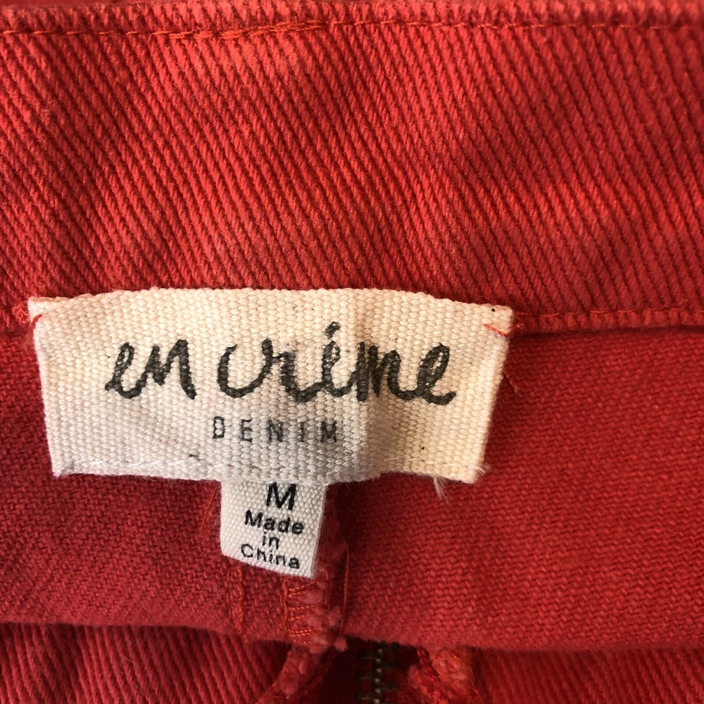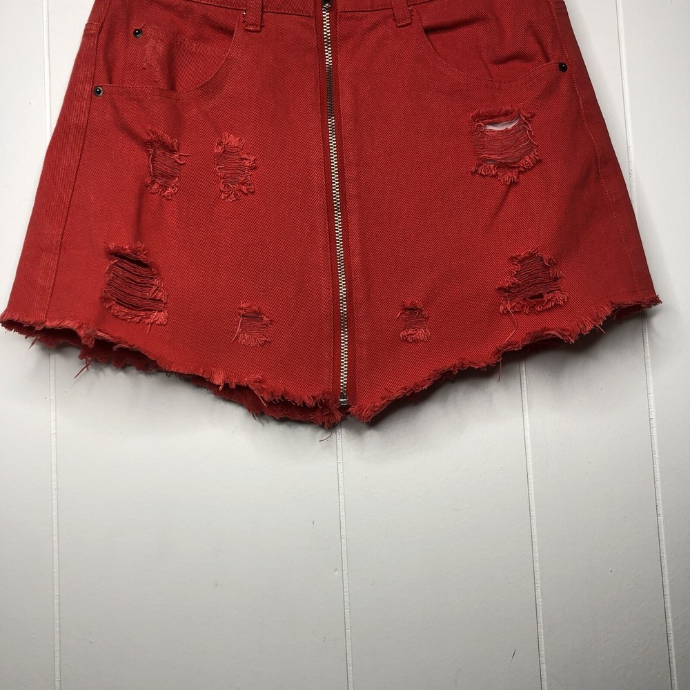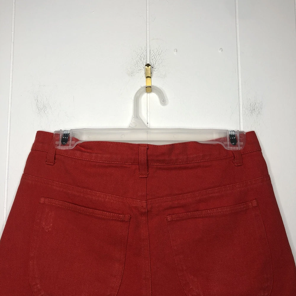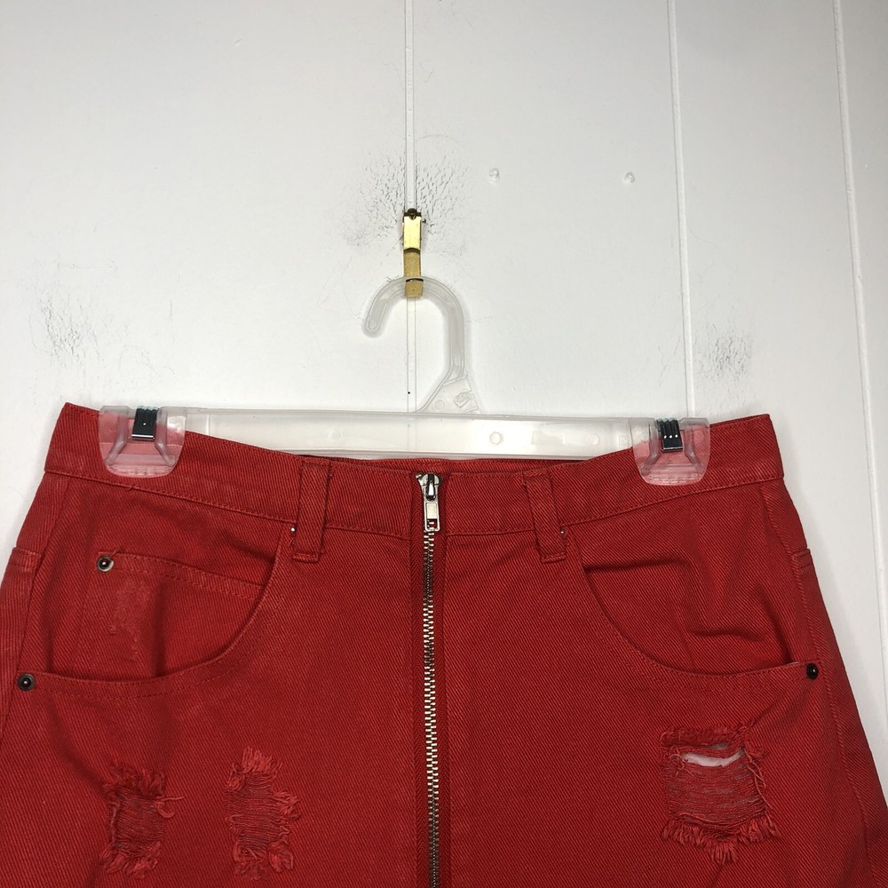En Creme Denim Mini Skirt Orange Zip-Up Distressed Mid Rise Pockets Frayed Hem 100% Cotton Size Medium Waist-28 in., 14 in. Laying Flat Length-13 in.