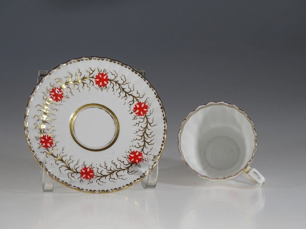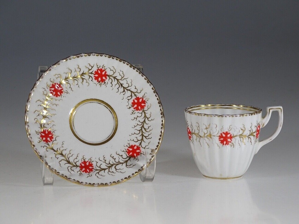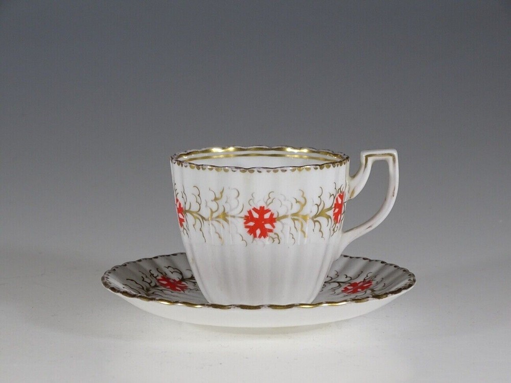 A wonderful fluted demitasse cup and saucer by Royal Chelsea. Features a white background with hand painted gold gilt leaves and vines and orange blossoms around the demitasse cup exterior and the saucer. Cup has Olde English style handle and accented in gold. Both the demitasse cup and saucer have scalloped edges trimmed in gold. This lovely tea cup and saucer would make an elegant addition to any tea service. Makes a memorable gift for the discerning collector or wonderful personal indulgence. Shipping: We fully insure all items and will gladly combine for shipping. 25 years of experience dealing with Vintage Collectibles and Antiques.