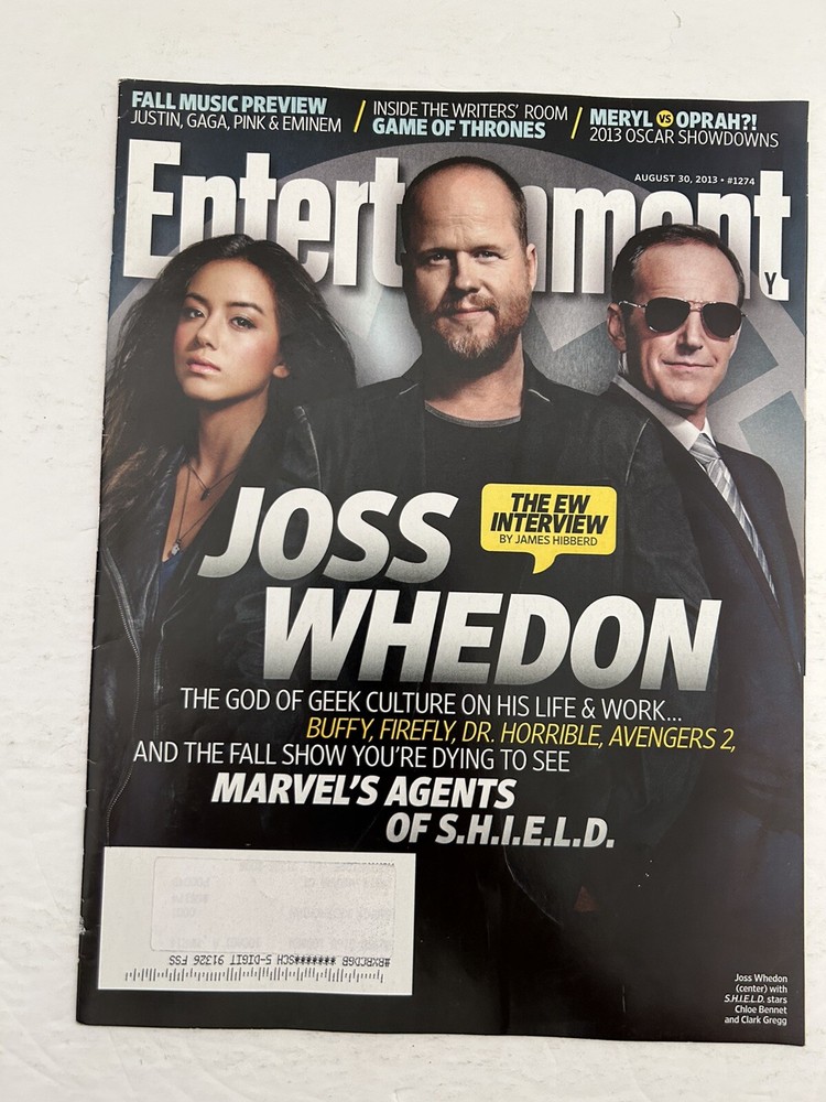 Entertainment Weekly Joss Whedon Marvel's Agents of S.H.I.E.L.D. August 30, 2013 Magazine - Condition is Brand New as Seen in Pictures - Smoke and Pet Free + Original Owners - 72 pages - Magazine Features: . Fall Music Preview: Justin, Gaga, Pink and Eminem . Inside the Writers' Room: Game of Thrones . Meryl vs. Oprah?! 2013 Oscar Showdowns . Joss Whedon: The God of Geek Culture on his life & work... Buffy, Firefly, Dr. Horrible, Avengers 2 . The Fall Show You're Dying to See: Marvel's Agents of Shield . Joss Whedon (center) with S.H.I.E.L.D. stars Chloe Bennet and Clark Gregg