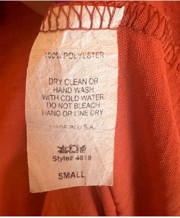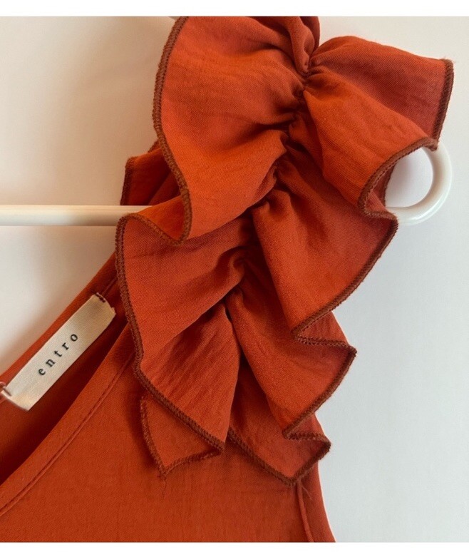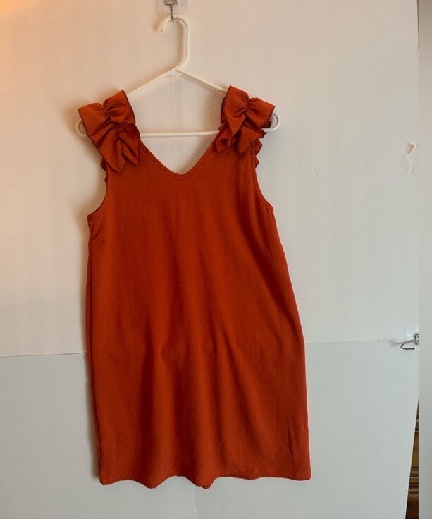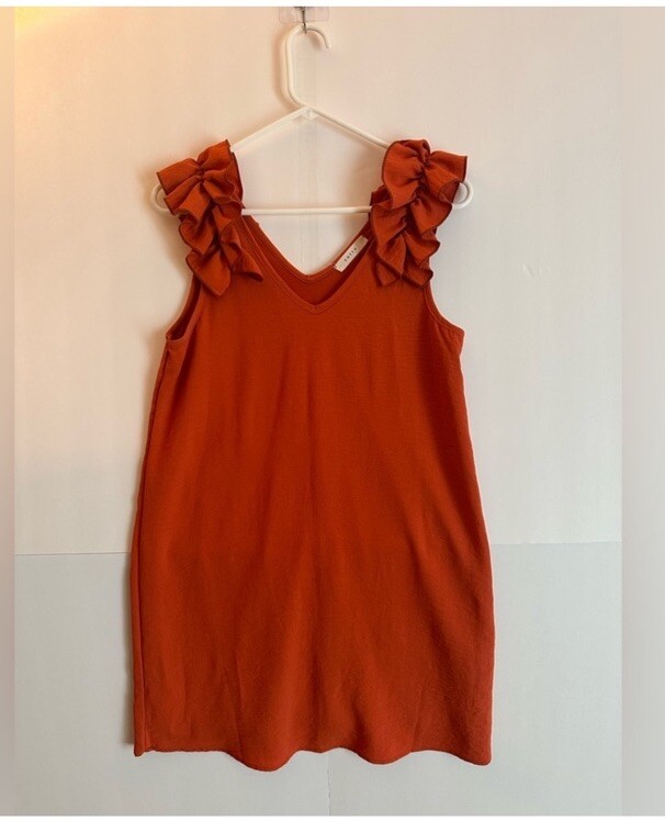 Size small Mid- thigh length V-neck front and back 100 % polyester Rust color Sleeveless with ruffle detailing on shoulders Pullover Measurements: Underarm to underarm: 17 in Length: 34 in