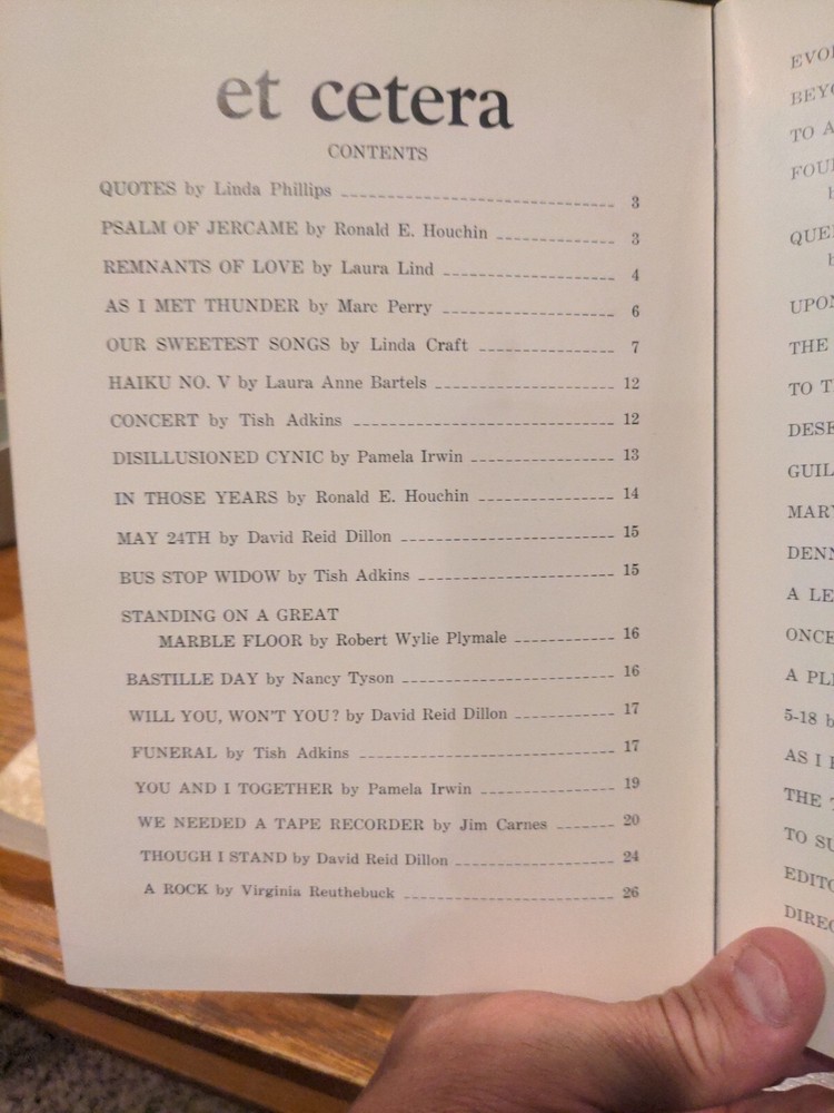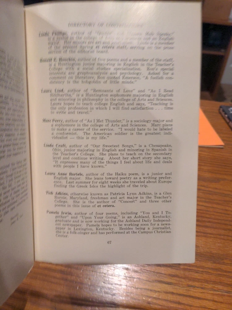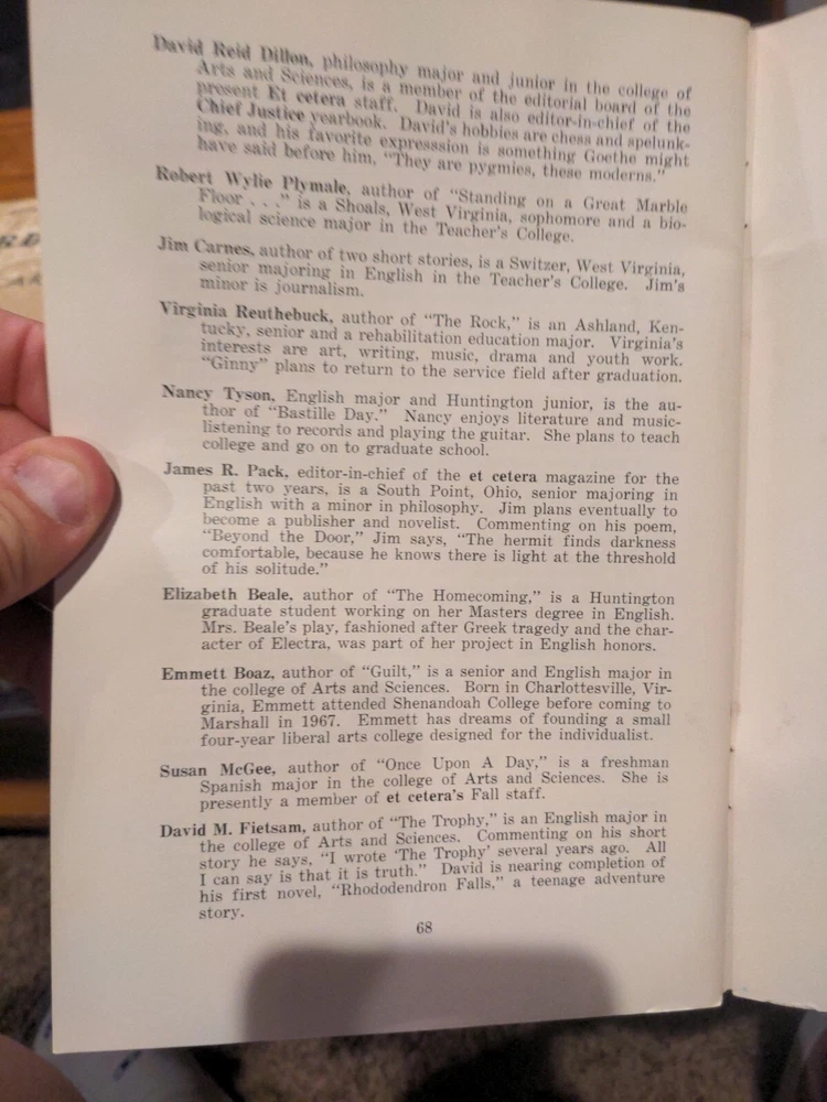 Et Cetera Spring 1969 Marshall University's Annual Literary Creative Writing & Art Magazine Et Cetera, founded in 1953, is the English department’s annual literary magazine that publishes the creative writing and artwork of Marshall University students and affiliates.