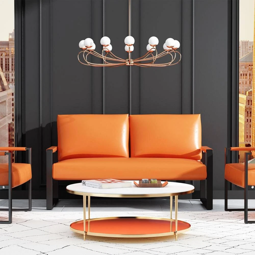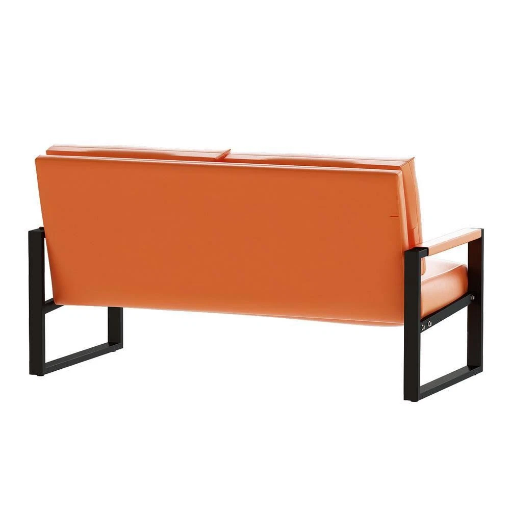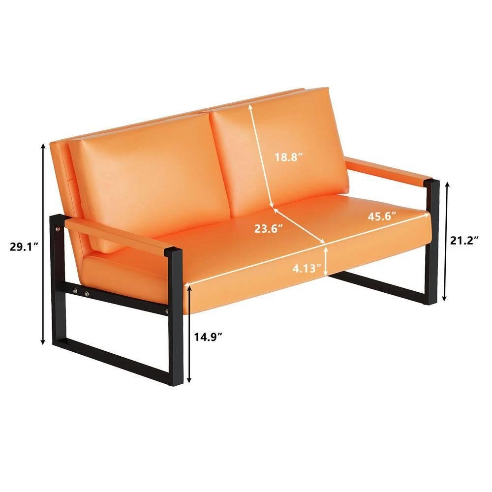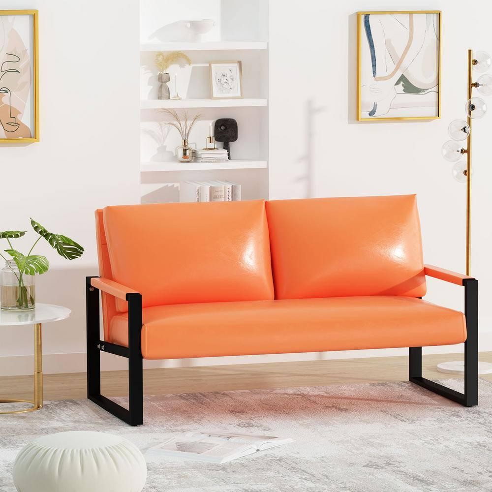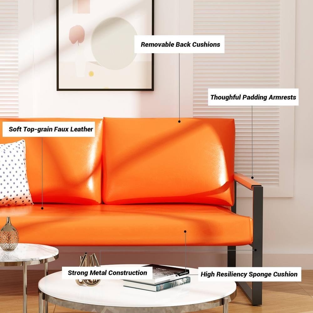 This loveseat is a total game-changer! The vibrant orange color adds a fun, modern pop to my living room, and the faux leather feels so soft and high-end. The cushions are super plush yet supportive—perfect for movie nights or lazy Sundays. The metal frame keeps it sturdy, even when my friends pile on. Plus, shipping was lightning-fast! Absolutely love it—worth every penny.