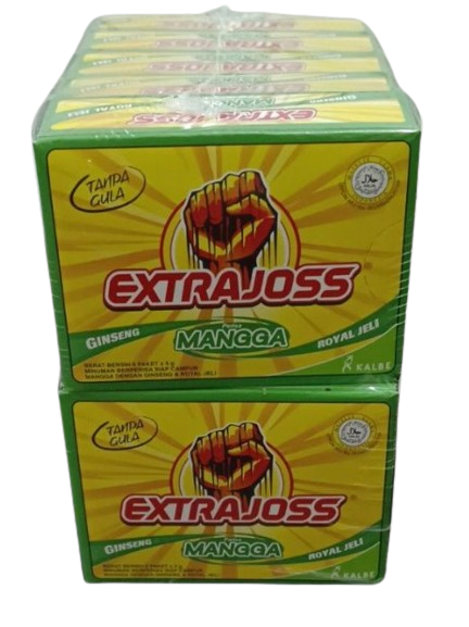 Extra Joss is an energy drink that helps body metabolism to produce extra energy, because it contains seven kinds of vitamin B, amino acid, caffeine, Korean ginseng, and royal jelly. Flavoured Drink Base Effervescent Powder With Ginseng & Royal Jelly Extra Joss is designed for an active lifestyle. It will recharge your working day. It is also a brilliant pre-sport or workout power up. The tropical fruit flavour tastes great and is Sugar Free. The 'Active' ingredients work in synergy to assist metabolism, stimulate confidence, increase physical endurance, overcome fatigue, sharpen the senses, and enhance reaction speed. Ingredients : Citric Acid Anhydrous, Sodium Bicarbonate, Taurine, Aspartame, Caffeine Anh, Ginseng Powder Extrat (10:1), Vitamin B8, Mixed Fruit Flavour, Vitamin B3, Vitamin B5, Vitamin B2 Sodium Phosphate, Mixed Fruit Durarome, Royal Jelly, Vitamin B6, Vitamin B1, Vitamin B12 (0.1% WS) Flavours:- -Rasa Manggo Packing: 24g