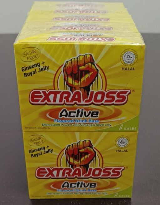 Extra Joss is an energy drink that helps body metabolism to produce extra energy, because it contains seven kinds of vitamin B, amino acid, caffeine, Korean ginseng, and royal jelly. Flavoured Drink Base Effervescent Powder With Ginseng & Royal Jelly Extra Joss is designed for an active lifestyle. It will recharge your working day. It is also a brilliant pre-sport or workout power up. The tropical fruit flavour tastes great and is Sugar Free. The 'Active' ingredients work in synergy to assist metabolism, stimulate confidence, increase physical endurance, overcome fatigue, sharpen the senses, and enhance reaction speed. Ingredients : Citric Acid Anhydrous, Sodium Bicarbonate, Taurine, Aspartame, Caffeine Anh, Ginseng Powder Extrat (10:1), Vitamin B8, Mixed Fruit Flavour, Vitamin B3, Vitamin B5, Vitamin B2 Sodium Phosphate, Mixed Fruit Durarome, Royal Jelly, Vitamin B6, Vitamin B1, Vitamin B12 (0.1% WS) Flavours:- Original Packing: 24g