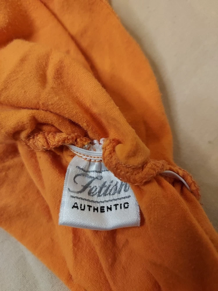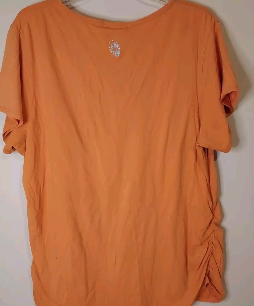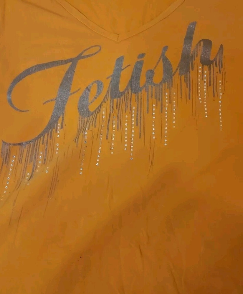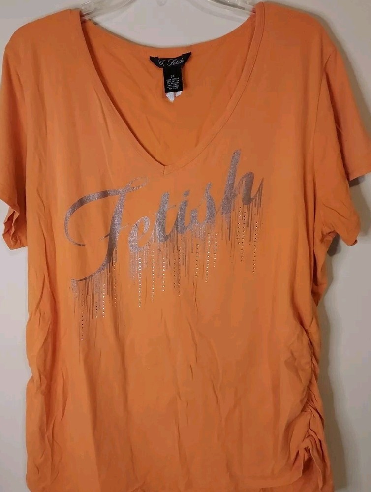 This vibrant orange top by Fetish is a must-have for any fashion-forward woman. The scoop neckline and short sleeves offer a chic and comfortable fit, while the rhinestone accents add a touch of glamour to the cotton blend knit fabric. The pullover style and mid-length sleeves make it easy to wear and care for, as it is machine washable. Available in size 3XL, this top is perfect for any casual occasion. Small hole lower front, see pic.