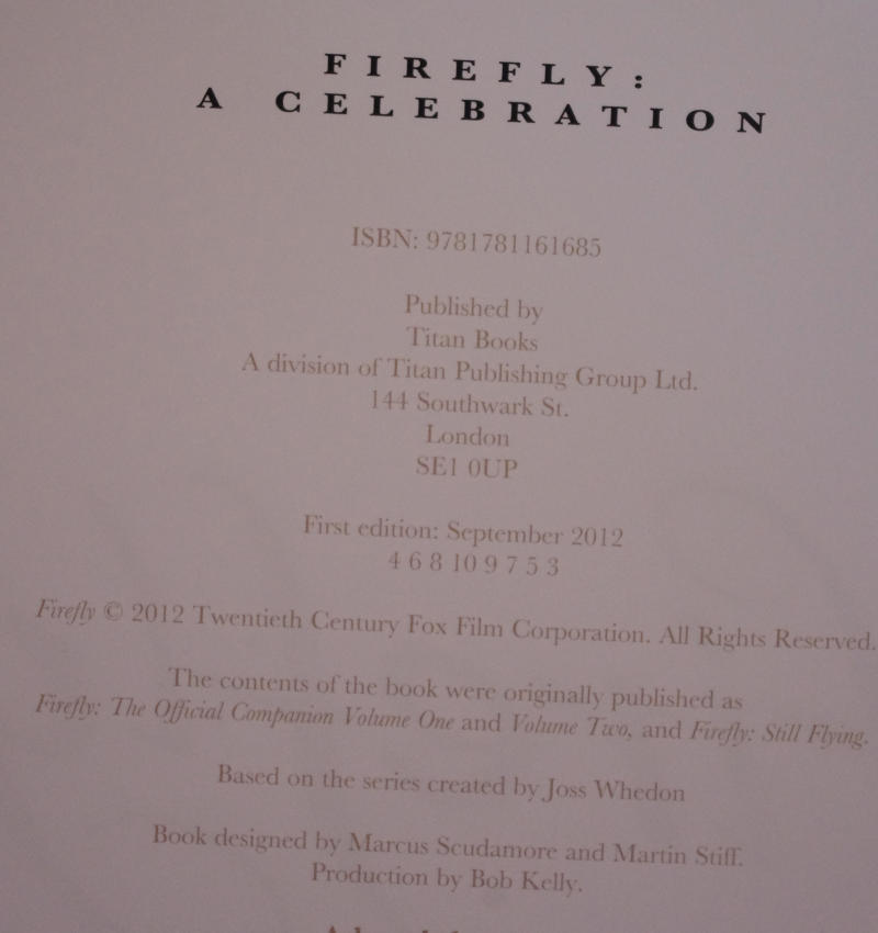 FIREFLY - A CELEBRATION, HC, 1st Edition 3rd print, 2012, Joss Whedon, Serenity FIREFLY - A CELEBRATION....(Hard cover)... Name of Comic(s)/Title?: FIREFLY - A CELEBRATION....(Hard cover).... Publisher: Titan Books.... Art by/Featuring/Stories?: Featuring a FIREFLY - A CELEBRATION hard cover....Artwork / writing by : Joss Whedon and more...Cover by; ?.....Story(s) : "?"....Collects "Titan's three hugely bestselling Firefly titles - The Illustrated Companion Volumes 1 and 2, and Still Flying - are collected together at last, just in time for the 10th-anniversary of Serenity and Avengers director Joss Whedon's beloved TV series. This huge, 544-page full-color volume is simply one of the most lavish books ever produced for a TV show, and is presented in a foil-stamped leather-effect binding with amzing printed bonus material."...We opened up the shrink wrap to see what edition this item was, never read/unused... Grade of item? : This issue is in FINE Condition (book terms), and NEAR MINT condition (in comic terms)...(unread)... Created when? : 2012... Front Cover description : As new, with very light handling/shelf wear... Back Cover description : As new... Page quality description : Brand new... Tape or writing?: No... Don't get caught napping... Stated 1st Edition! and showing 3rd printing on the publisher's info page.... ...See more SERENITY, SCI-FI, Joss Whedon, MOVIE/TV , & BOOK items in our store. : Here! Be sure to check out all of our current on-going auctions! Lots of great product at affordable prices! Bookmark our listings with (control + D). Lots more coming in the next few weeks... Check out the scan(s). If you like this? Our store name is HighQualityComics...aka HQComics... We have been doing mail-order since 1988. We guarantee Absolute Satisfaction on All Orders! Shipping in a box. Combine auctions to save on postage. INTERNATIONAL CUSTOMERS : Email us for international shipping rates & acceptable ways to pay. INTERNATIONAL CUSTOMERS : Email us for acceptable ways to pay and shipping options, before you place an order. Thanks! This listing created with GLETech Multiple Selling Channel tools.