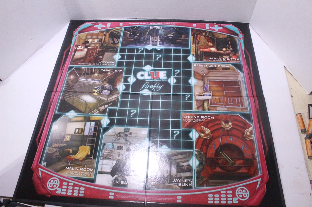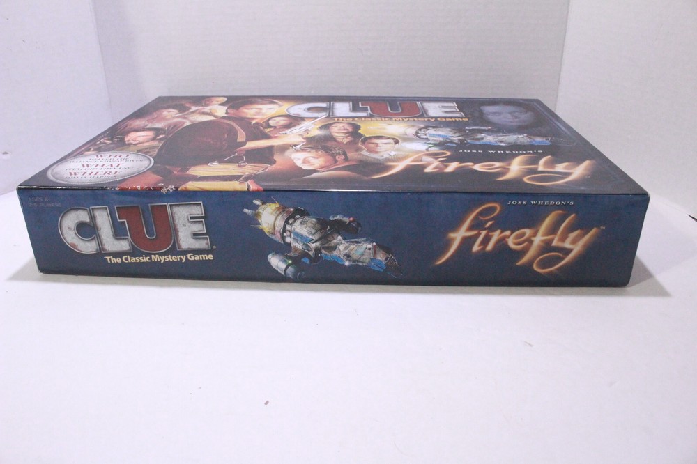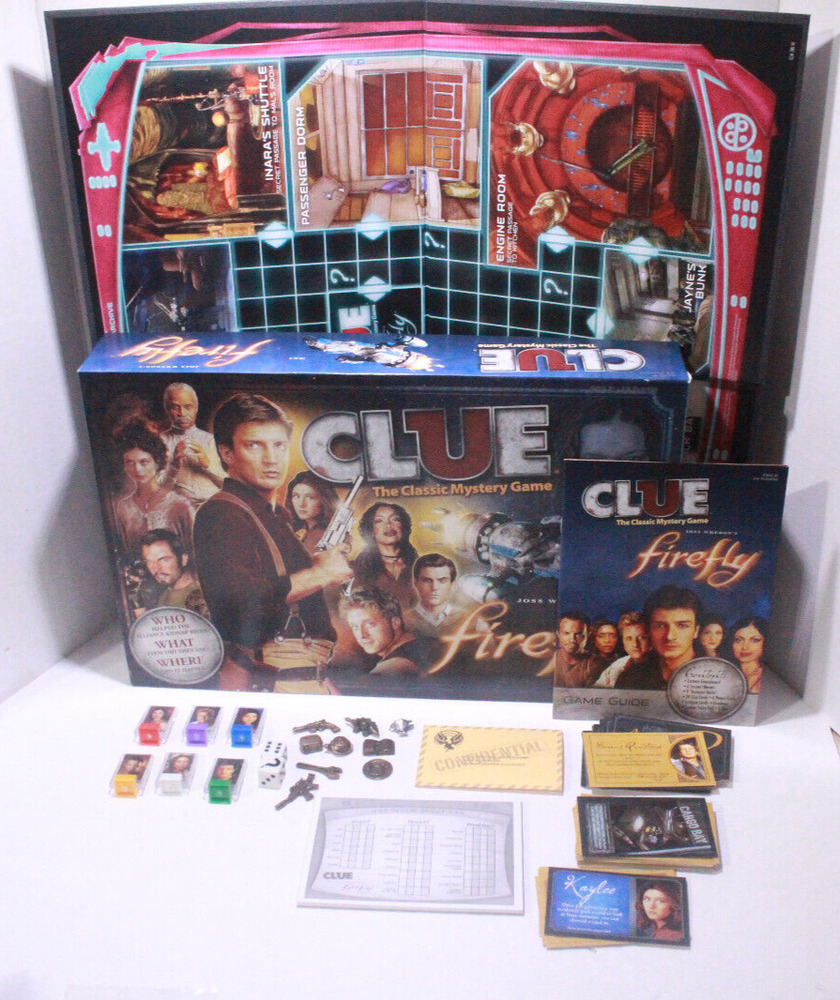 Clue: Firefly Edition you are bidding on a Complete Clue: Firefly Edition (2014) Includes: 1 Game Board Six (6) Suspect Movers Six (6) Power Cards 24 Clue Cards Intrigue Cards Custom Score Pad Envelope Nine (9) Betrayal Items Two (2) Dice Rules Please Message me if you have any Questions Payment Must be received within 5 days Please Contact Seller for shipping charges to Alaska and Hawaii (usually same as above) Please Contact Seller for shipping charges to all other courtiers outside the US E-checks and Other Checks: After check is cleared then items will be shipped usually takes up to 5 days to clear We Do Combine Shipping