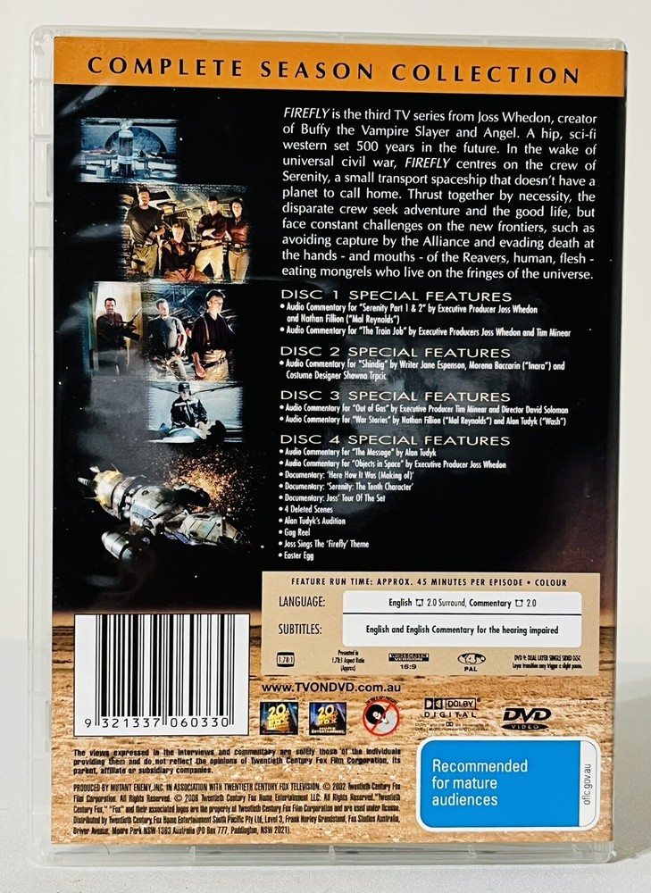 Immerse yourself in the unique blend of sci-fi and western genres with the complete season collection of "Fire Fly" on DVD. Directed by Joss Whedon, this M-rated TV series follows a crew of renegades aboard the spaceship Serenity as they navigate through a universe filled with aliens, creatures, and supernatural elements. Set in a distant future, this cult favourite from 20th Century Fox offers an intriguing mix of action, drama, and adventure that will keep you captivated from start to finish. Perfect for fans of unconventional storytelling and unforgettable characters. Please view photos as this shows the condition of the dvd I am happy to combine postage for multiple purchases. If you require more than a couple of days to make payment please let me know. Please request a combined invoice from me directly before paying, otherwise your items will be sent separately. All items are well packed and sent via Australia Post with tracking provided.