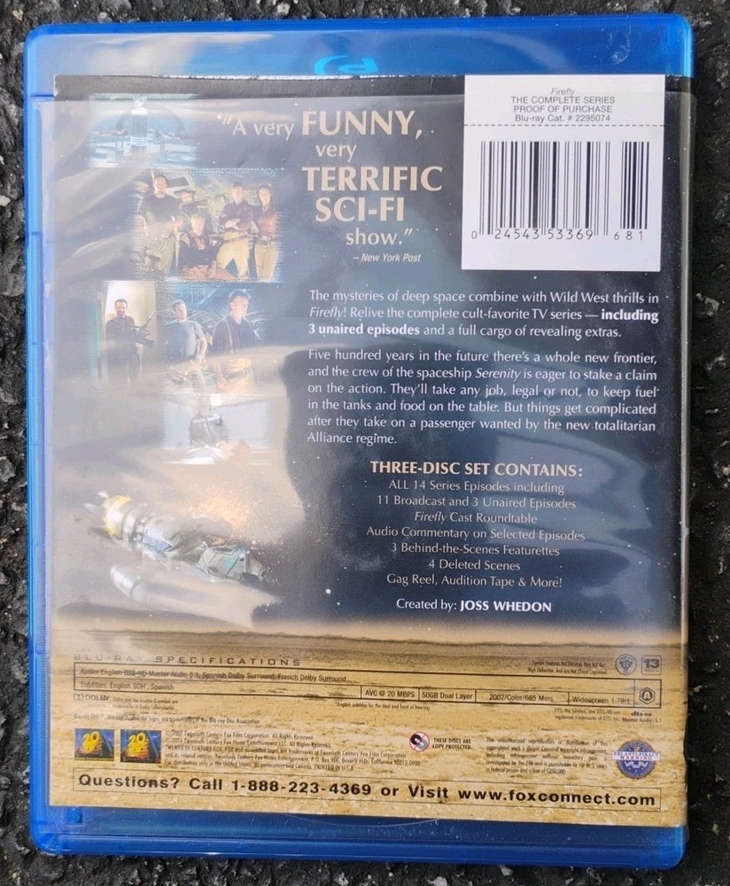 You are looking at: FIREFLY: The Complete Serie Blu-ray (3-Disc Set, 2014) Joss Whedon, Sci-fi Space. Includes: Clamshell Case, ArtWork and Three (3) Original Blu-ray Discs. 665 Minutes of Entertainment. In Very, Very Good Condition. From a Smoke and Pet Free Home. See Photos for more Details and Description. Authentic. L247.