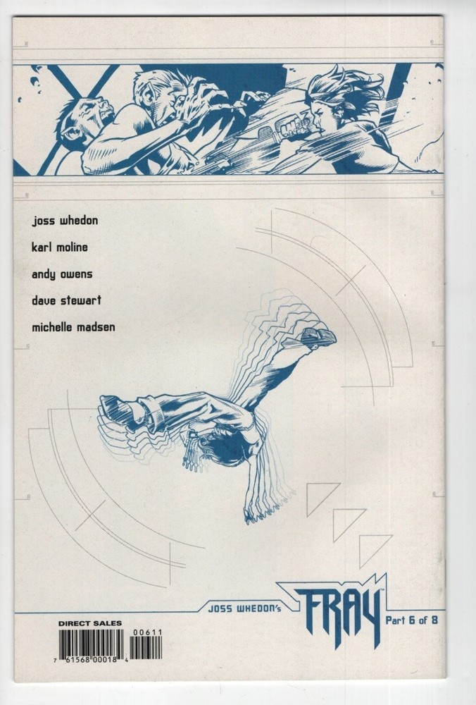 Joss Whedon's FRAY #6 comic book by JOSS WHEDON, KARL MOLINE, and ANDY OWENS; cover by KARL MOLINE After a crushing turn of events, Melaka's back on her feet, taking the fight into the pits of the city, the rat-infested warren she calls home. But are these street-urchin vamps behind the recent murder that set Fray over the edge? Entertainment Weekly made Fray Winner of the Week when it debuted, helping the first printing of the book to sell out. As Joss Whedon and his art team of Karl Moline, Andy Owens, and Dave Stewart take Fray into its last act, comics readers are in for all the twists and turns they've come to expect from Joss's TV shows. 32pg Cover price $2.99. This comic book has been preserved in FINE collector’s condition (CREASES ON SPINE OF COMIC BOOK, SEE PHOTO OF COMIC BOOK) , and each comic book comes in a plastic comic sleeve with an acid-free backing board. An essential for any BUFFY THE VAMPIRE SLAYER, FIREFLY, SERENITY, JOSS WHEDON, or fan or collector. Please check out our other BUFFY THE VAMPIRE SLAYER , ANGEL SEASON 6, and SERENITY COMIC BOOK AUCTIONS. We will combine shipping on multiple winning items. Shipping is via USPS MAIL and includes insurance within the United States.