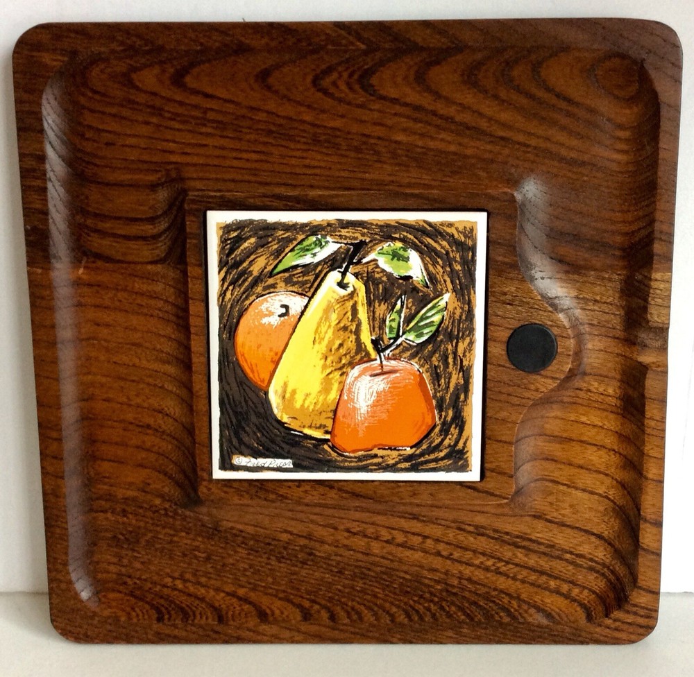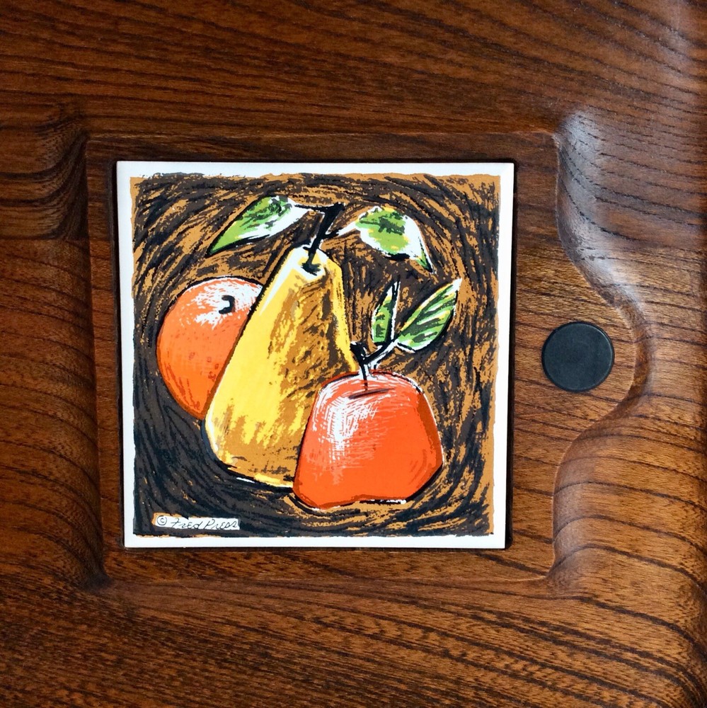 FRED PRESS, CHEESEBOARD, SQUARE, APPLE PEAR ORANGE, MID-CENTURY. Condition is "Used". F red Press signed art tile h and-carved cheese board. Measures 9-7/8” square. In excellent condition, n o c h i p s , c r a c k s o r u t e n s i l m a r k s . N o k n i f e . Original tags on back. V i n t a g e i t e m a n d s o l d a s i s . Email any questions you have and thanks for viewing .