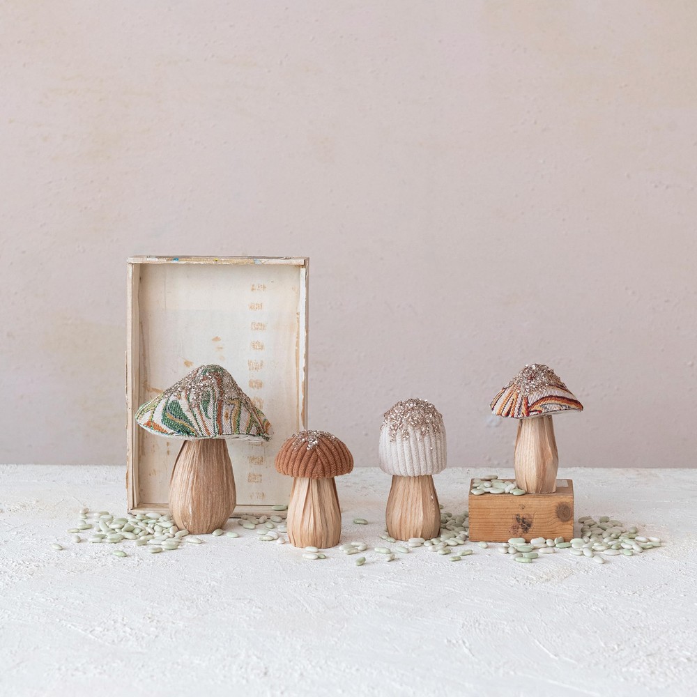 This fabric-topped foam set is a delightful and enchanting accessory that can enhance the home. It features a set of 4 fabric-topped foam mushrooms with a wood base, sequins, and glitter, a multicolor body, and a round shape, giving them a colorful and shiny look. The mushrooms have a realistic and detailed shape that is pleasing to touch and look at. The mushrooms also have a fabric top, which adds some contrast and texture to their appearance. This fabric-topped foam set is a whimsical and sparkling piece that can add some personality and to any decor style, from woodland to eclectic. It is ideal for bringing some nature and joy to the home, where it can make any space feel more cozy and serene. It is made of foam and pine wood that are durable, smooth, and easy to clean. This is a perfect choice for anyone who loves whimsical and enchanting home decor. A set of 4 fabric topped foam mushrooms with wood base, sequins, and glitter, a multicolor body, and a round shape A whimsical and sparkling piece that can add some personality and to any decor style, from woodland to eclectic Ideal for bringing some nature and joy to the home, this fabric topped foam mushrooms set can be placed on a table, a shelf, or a dresser Made of foam and pine wood that are durable, smooth, and easy to clean 4" Diameter x 5" H, 3" Diameter x 4.25" H, 2.25" Diameter x 4.5" H & 2.5" Diameter x 4" H
