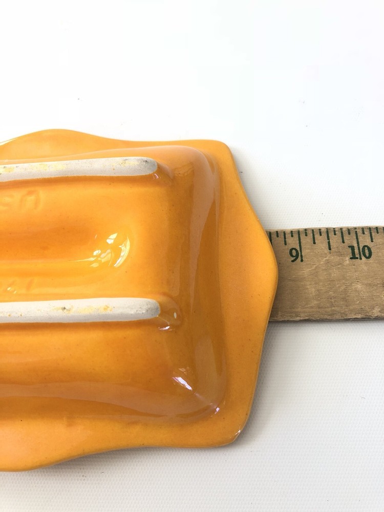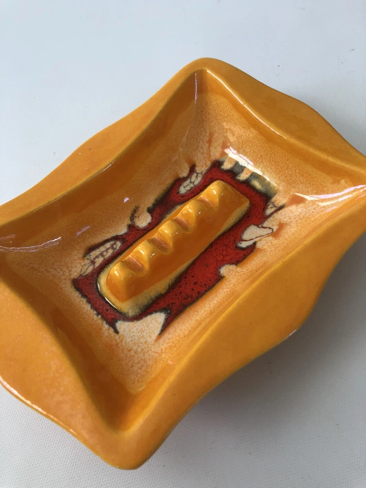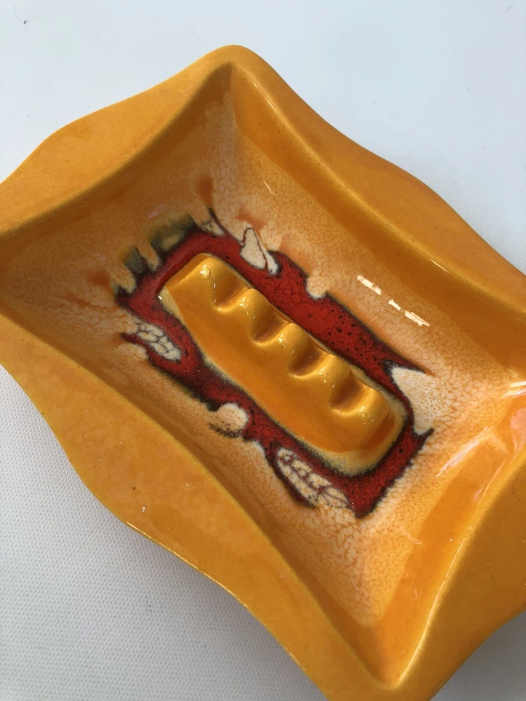 Fabulous Mid Century Mod Orange Drip Glaze Ashtray /Trinket Dish 9x6”. Condition is Used. Shipped with USPS Priority Mail. Tiny flea bite on glaze but still good condition sold as is