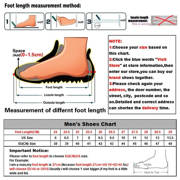 size: Please note. Simple packaging, in order to better protect the shoe CN/EU 39= US 6.5= Foot Length 245mm CN/EU 40= US 7.0= Foot Length 250mm CN/EU 41= US 8.0= Foot Length 255mm CN/EU 42= US 8.5= Foot Length 260mm CN/EU 43= US 9.5= Foot Length 265mm CN/EU 44= US 10 = Foot Length 270mm CN/EU 45= US 11 = Foot Length 275mm CN/EU 46= US 12 = Foot Length 280mm CN/EU 47= US 13 = Foot Length 285mm CN/EU 48= US 13.5= Foot Length 290mm Size:39,40,41,42,43,44,45,46,47,48 Why buy from us? Worldwide fast shipping! Free tracking number! Quickly and satisfying communication! Unique high-quality goods! Best prices! Please reference our size picture carefully! Measured by hands, please allow 1-3mm error! Due to computer monitor, may exist some color error, please do not mind!