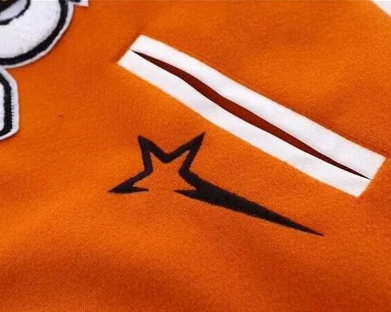 Crafted for the modern man with a classic twist, this Orange Varsity Leather Jacket melds timeless style with contemporary fashion. The mid-length cut and wool & leather construction promise warmth and comfort, making it an ideal choice for the transitioning seasons. The jacket features a solid orange hue accented with tasteful button details, catering to a casual yet polished look. This varsity jacket, inspired by the 'Easy Rider' model, offers a regular fit in all sizes with a lightweight design that's suitable for baseball and various outdoor activities. It is designed for ease of movement with a button closure, ensuring both functionality and a sharp aesthetic. The garment is proudly made in Pakistan, emphasizing on the craftsmanship and quality that goes into each piece.