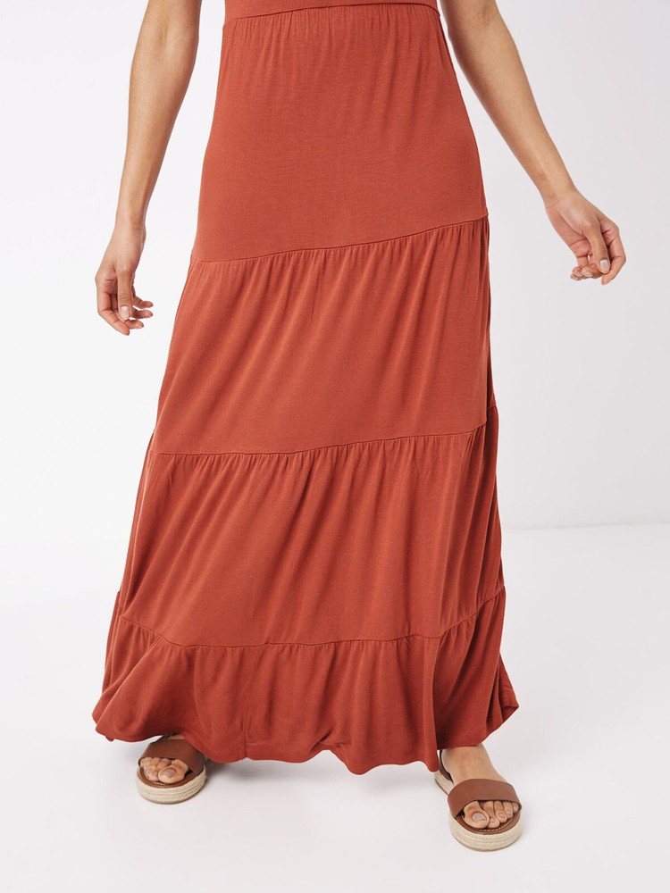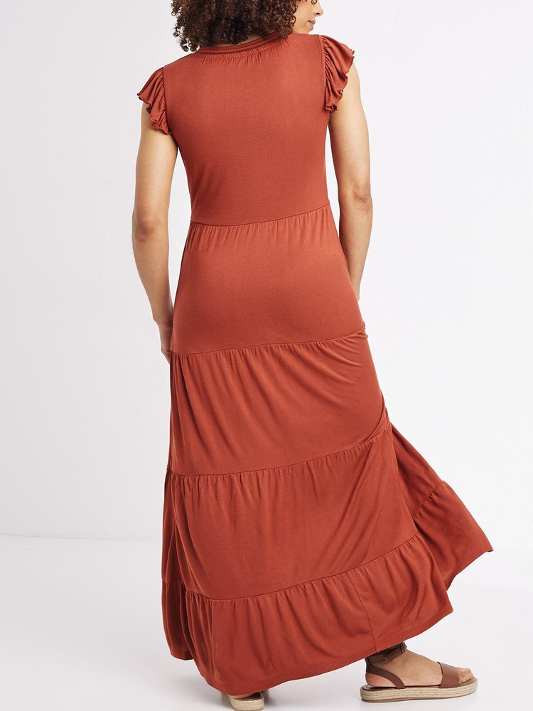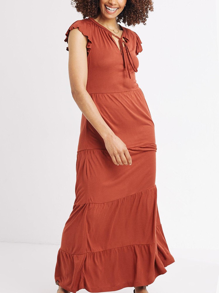 Suki Jersey Maxi Dress by Fat Face (RRP £56.00) This flattering maxi dress is a true wardrobe staple you'll reach for again and again. Made from comfortable and lightweight viscose, it features a pretty tiered design, frilled sleeve detailing, and adjustable neck fastening to ensure the perfect fit. Length 50in. Material: 100% Viscose care: Machine Wash