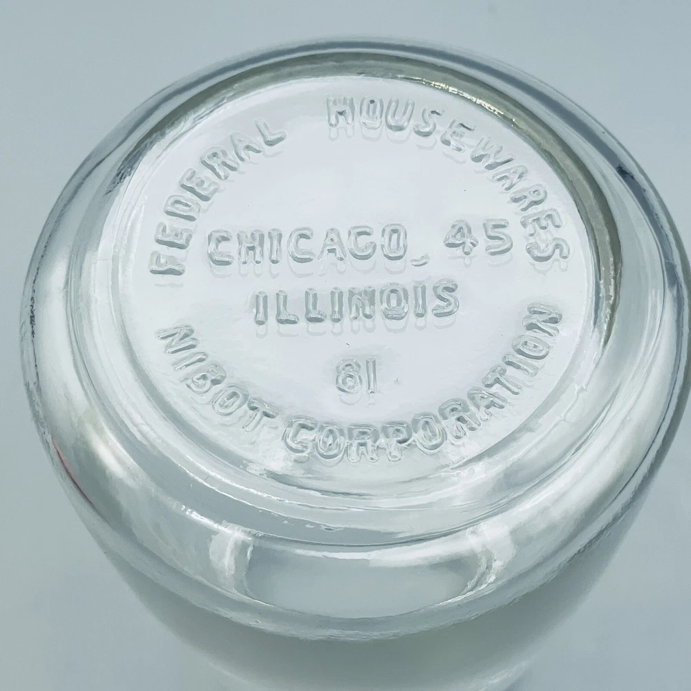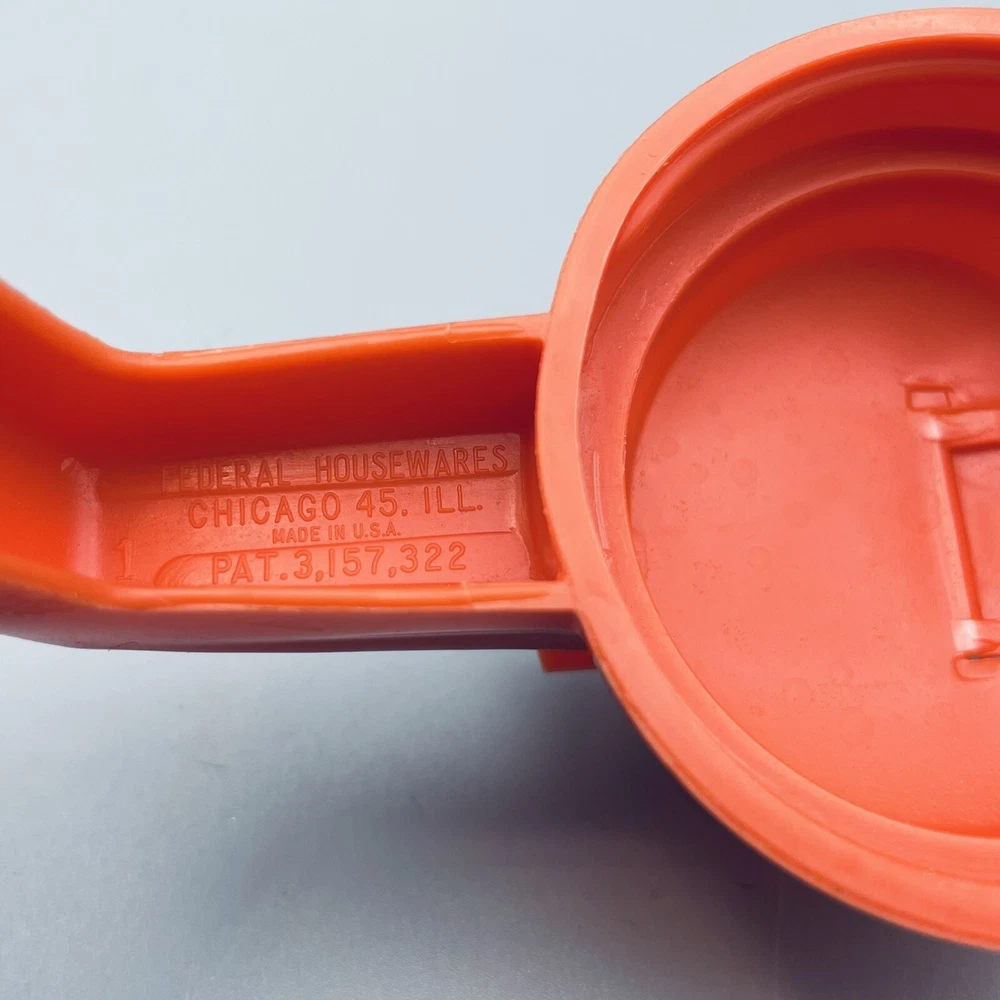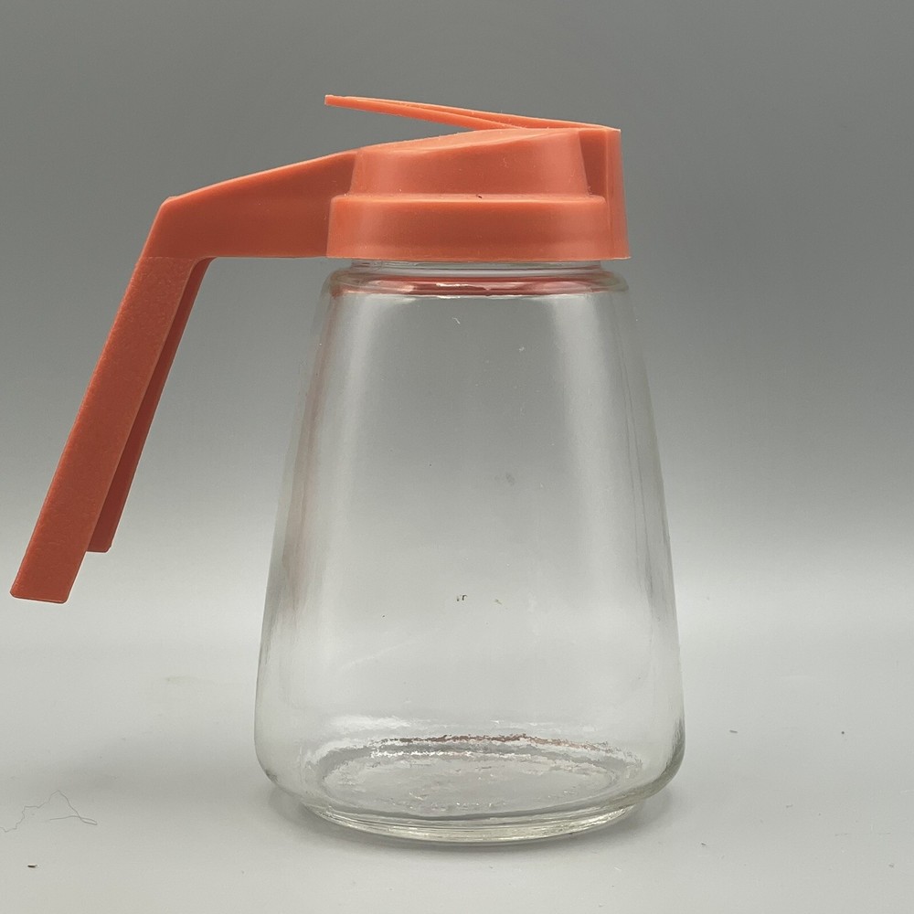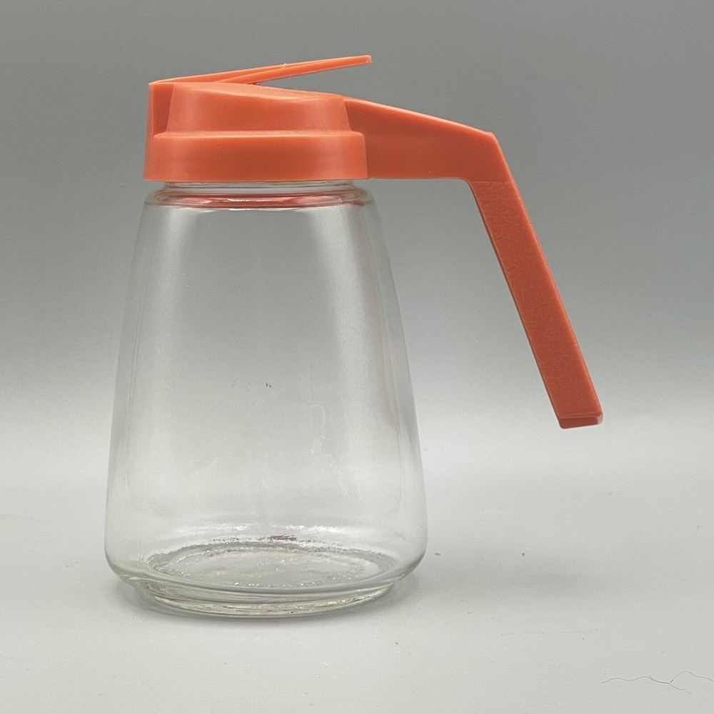 Vintage Federal Housewares Syrup Pitcher. It has a Orange plastic top and a clear glass base. Stands about 5 1/2 inches tall and holds approximately 12 ounces. The base is marked Federal HousewaresChicago, ILNibot Corporation Good condition. Shipping 1 lb from 30114