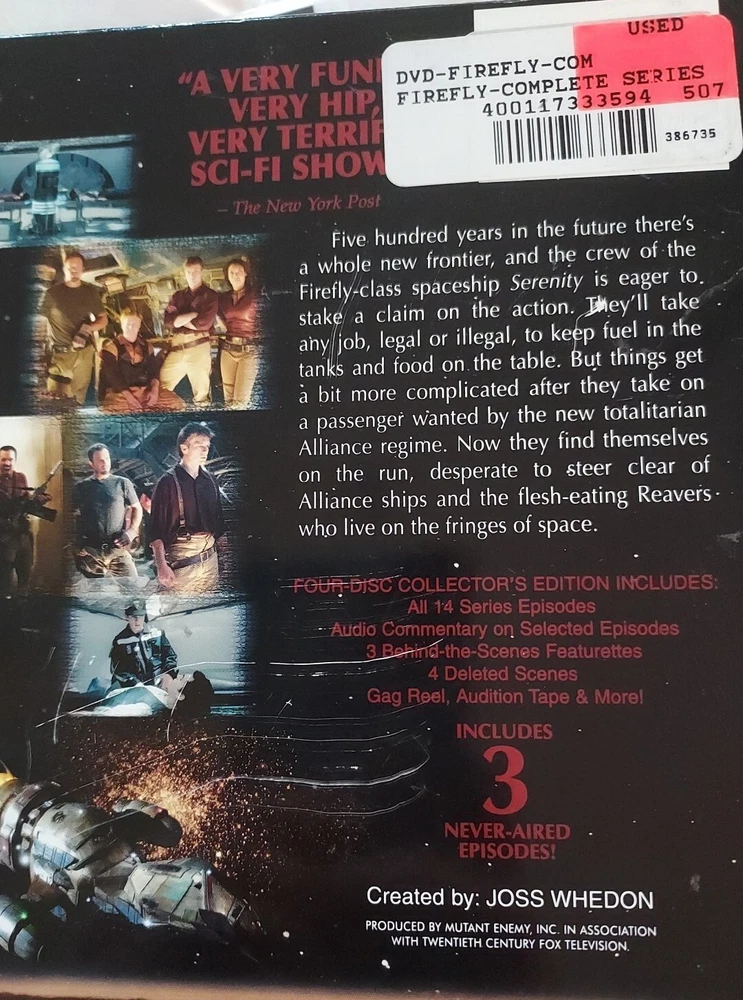 Immerse in the sci-fi world of Firefly with this complete series DVD set. Featuring four DVDs, this set includes all episodes of the show produced by Gareth Davies, and directed by Allan Kroeker, David Solomon, James A. Contner, Joss Whedon, Marita Grabiak, Michael N. Grossman, Thomas J. Wright, Tim Minear, Vern Gillum, and Vondie Curtis-Hall. The set comes in English language and released in the year 2002 by 20th Century Fox studio. This DVD set is perfect for fans of TV sci-fi genre, especially those who love family-oriented shows. Additionally, this set makes a great gift for collectors and enthusiasts alike. So, grab your popcorn and enjoy the adventure and excitement of Firefly with this amazing DVD set.