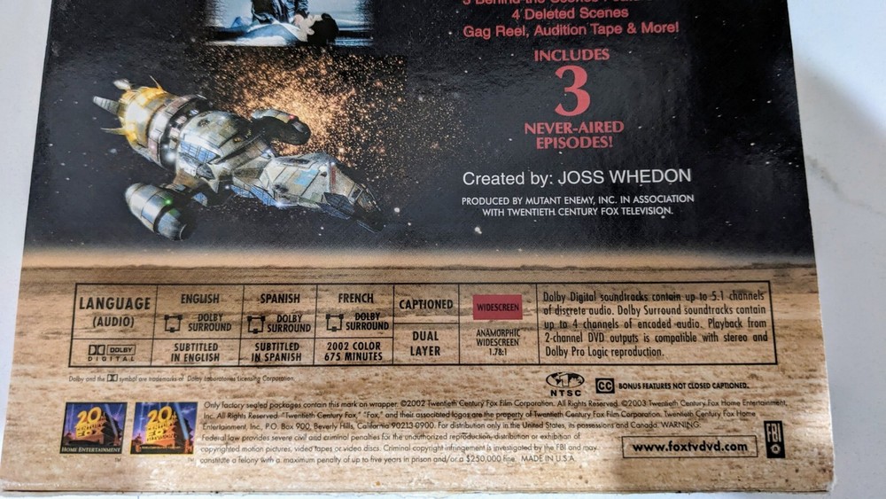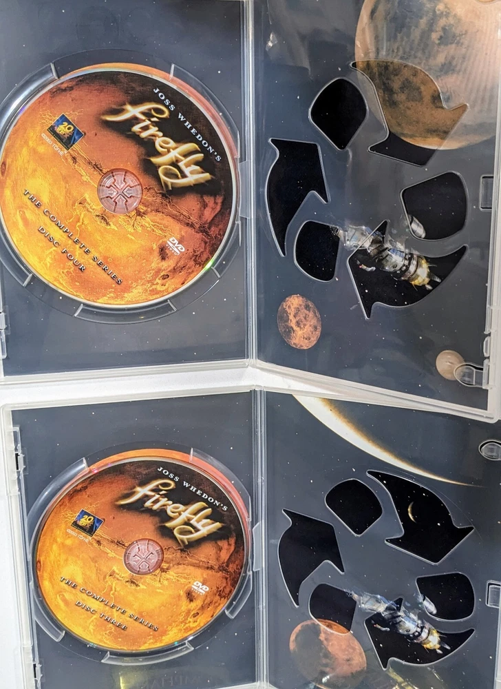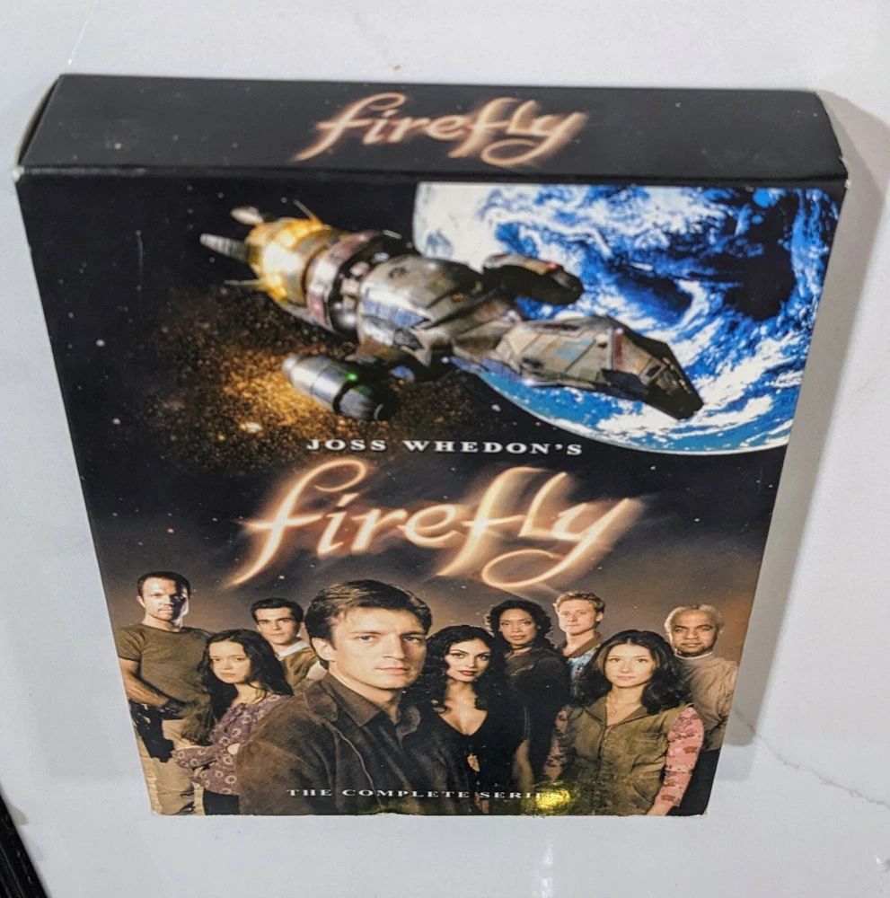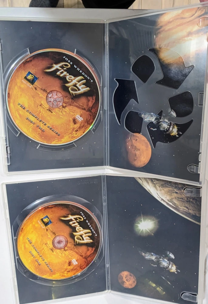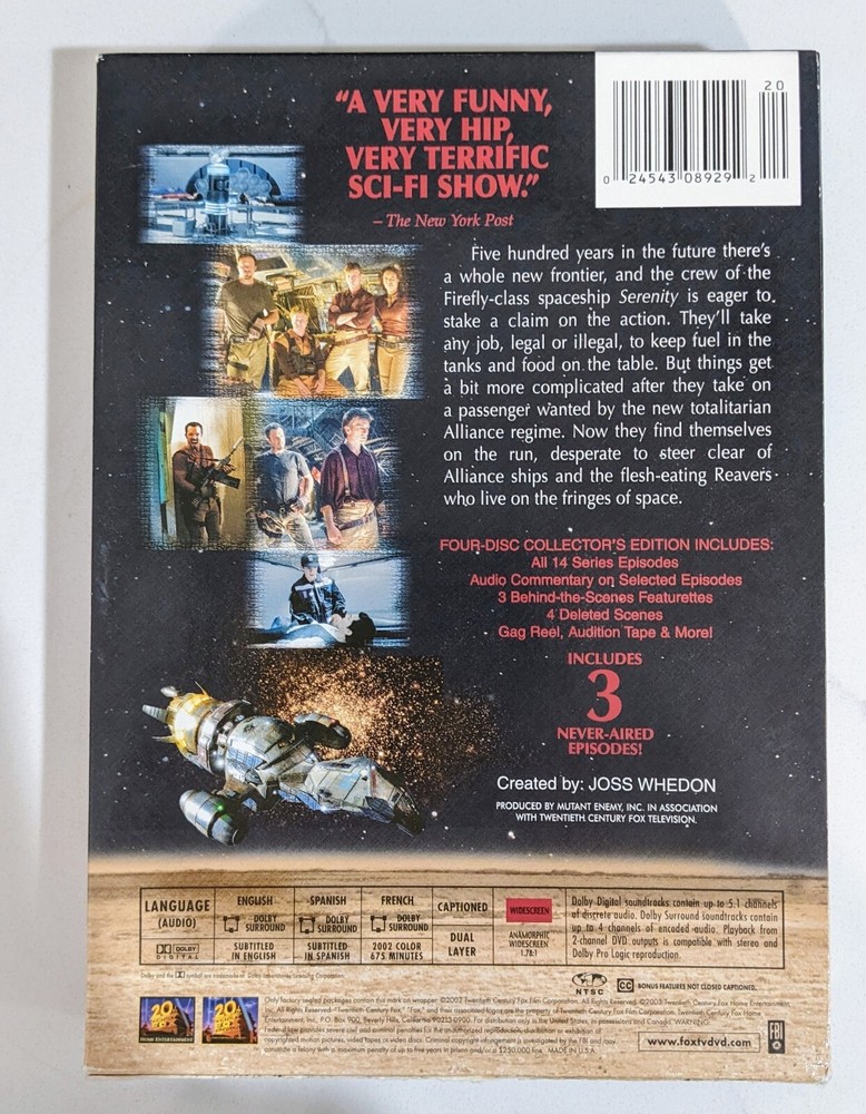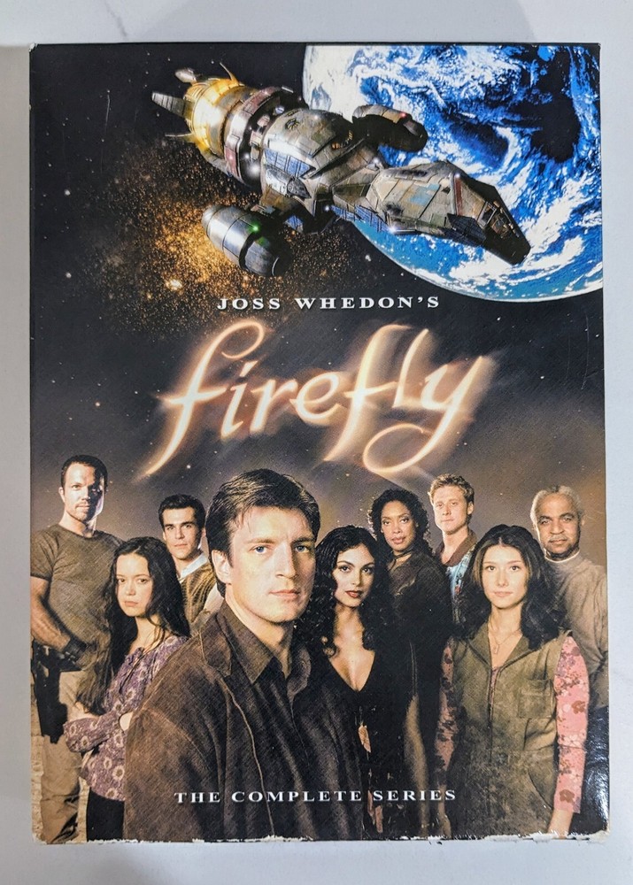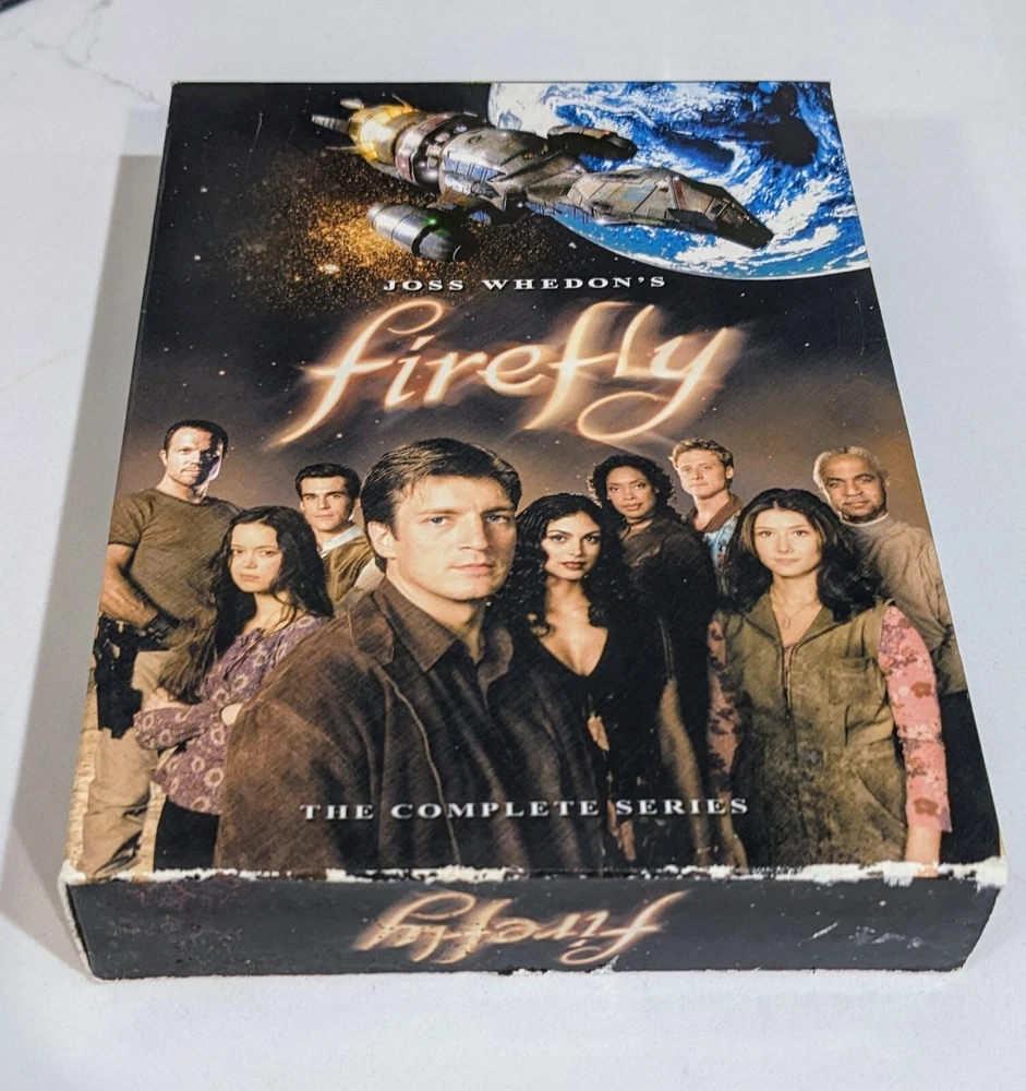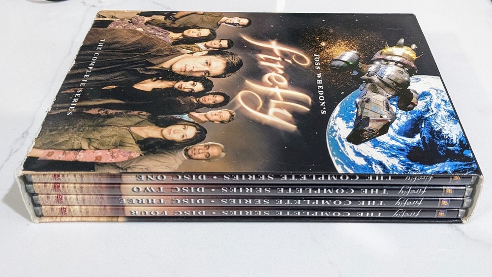 Box has some wear and tear but the discs are in great condition. Complete series, Joss Whedon's Firefly. Set 500 years in the future after a universal civil war, the crew of a small transport spaceship takes any job so long as it puts food on the table. The disparate men and women just want to survive and maybe have better lives, but they face constant challenges on the new frontier, such as the Reavers -- flesh-eating mongrels who live on the fringes of the universe.