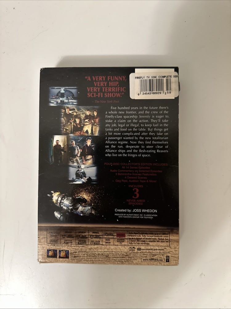 Immerse yourself in the captivating world of "Firefly" with this complete series box set on DVD. Created by Joss Whedon, this sci-fi and fantasy TV series follows the adventures of a renegade crew aboard the spaceship Serenity. Released in 2014, this 14A-rated show offers a unique blend of action, drama, and humour that will keep you on the edge of your seat. Add this bilingual DVD set to your collection and experience the magic of "Firefly" all over again.