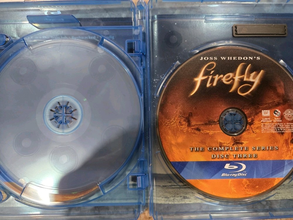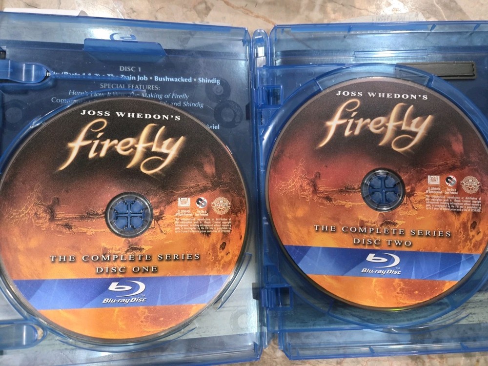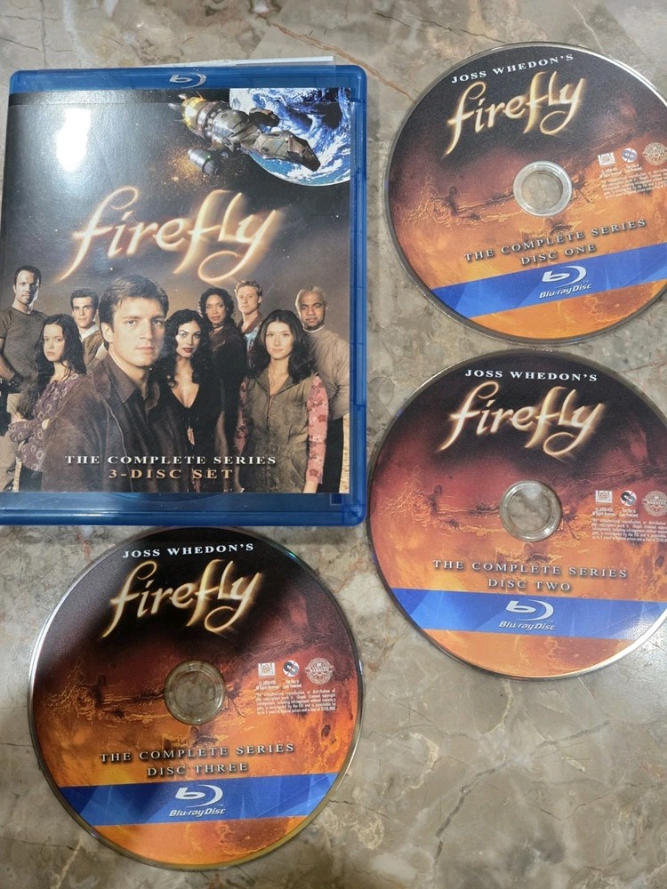 case is chipped on the end. Embark on a thrilling journey through the 'verse with "Firefly: the Complete Series" on Blu-ray, the 2002 three-disc set that brings the critically acclaimed TV Sci-Fi saga to your home theater. This collection includes all the gripping episodes of the series created by Joss Whedon, featuring the unforgettable performances and sharp writing that have made it a cult favorite. Experience the adventures of the crew of the spaceship Serenity as they navigate an intricate plot of politics, war, and heroism. With a total run time of 665 minutes, this set provides an immersive viewing experience in high definition, courtesy of 20th Century Studios. Delve into the rich universe of Firefly with this essential Blu-ray compilation.