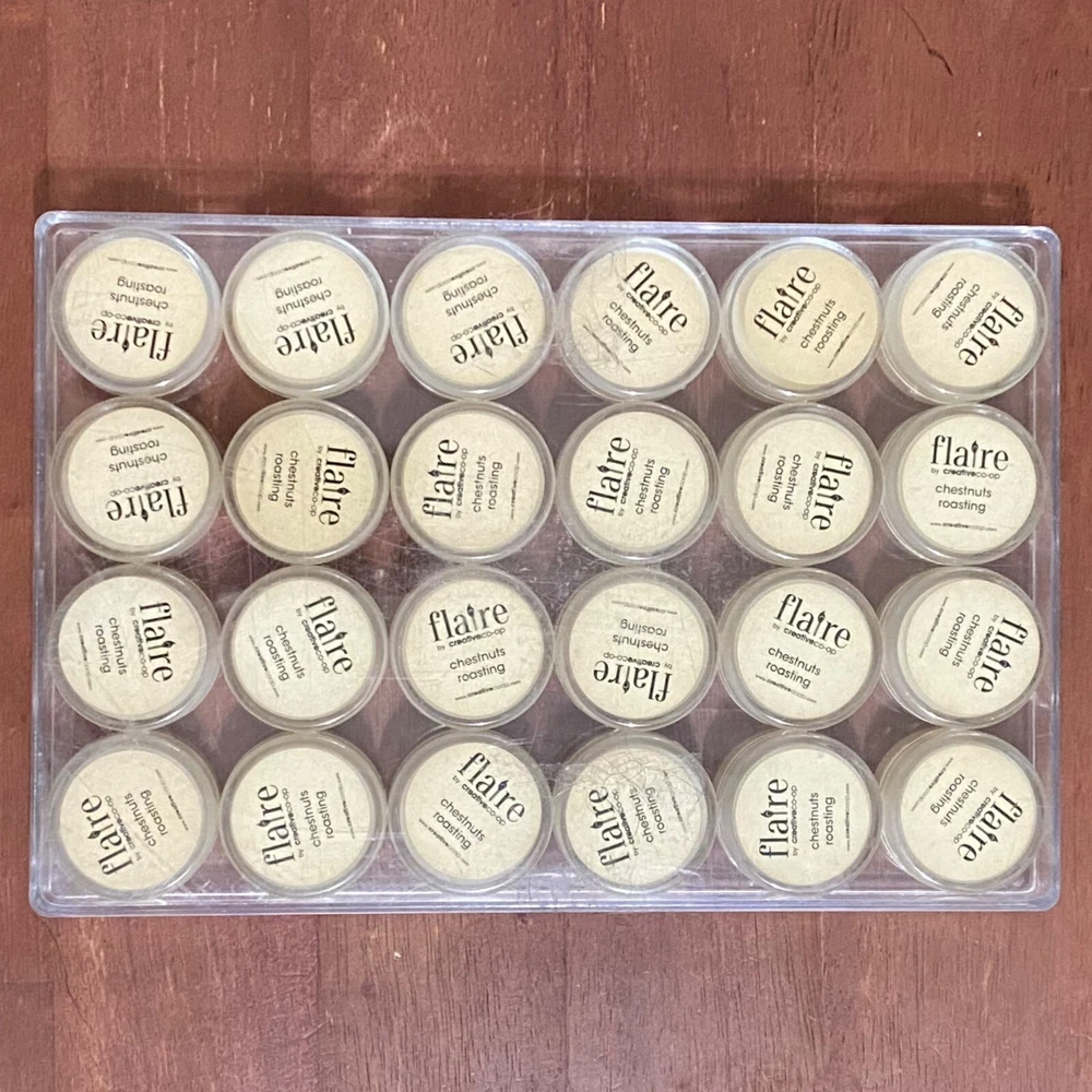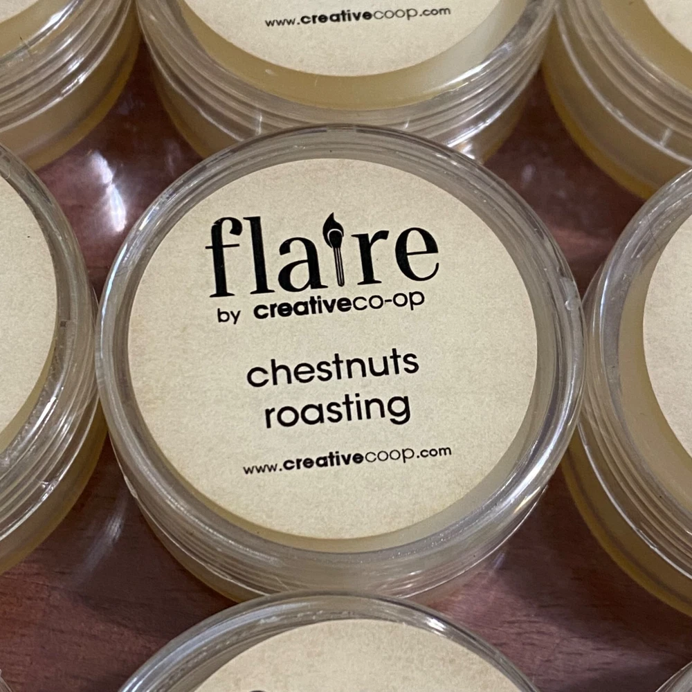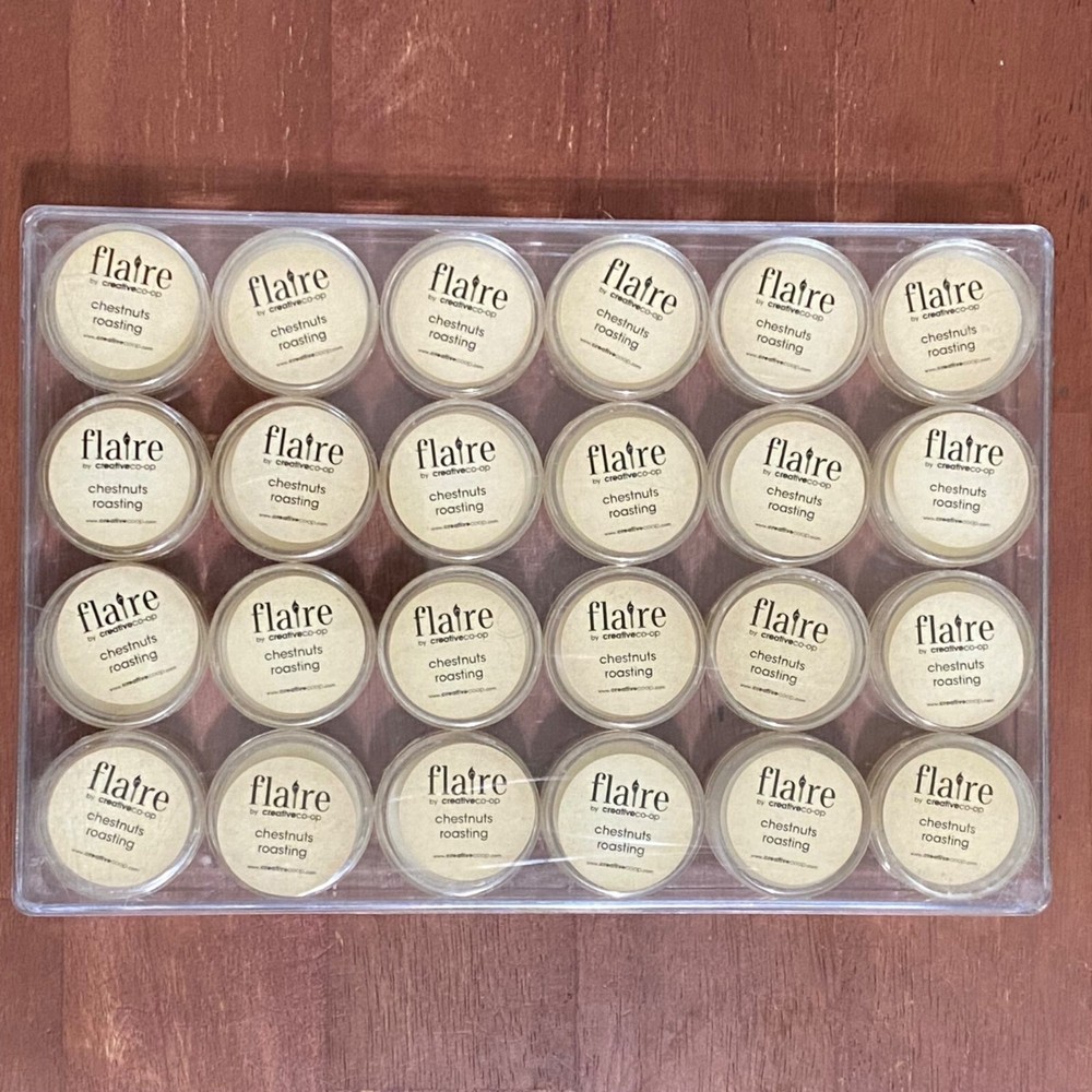 Creative Co-Op Flaire Scent Sample Wickless Candle Lot of 24 Chestnuts Roasting scent 1.25 inch diameter .75 inch height Remove the lid and place anywhere you would put a candle Can be used in a warmer Unused Case is cracked