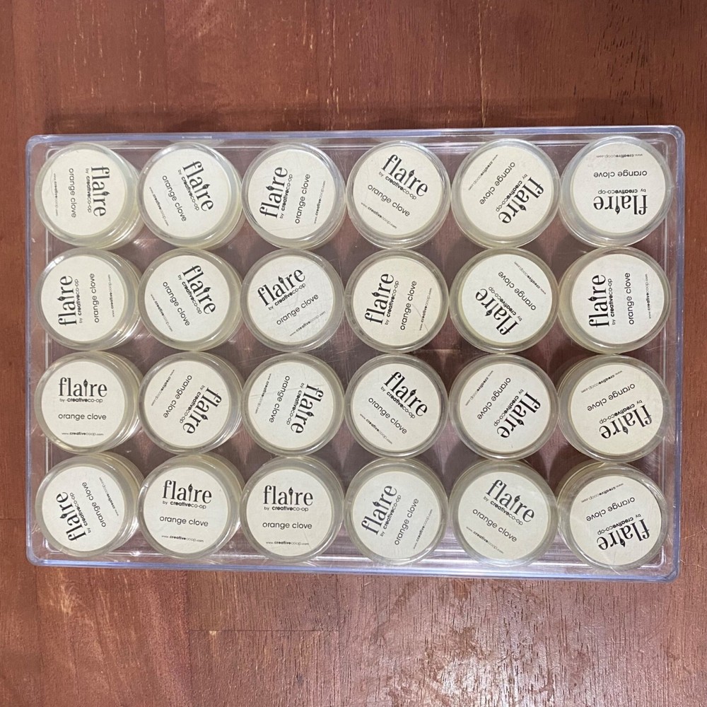 Creative Co-Op Flaire Scent Sample Wickless Candle Lot of 24 Orange Clove scent 1.25 inch diameter .75 inch height Remove the lid and place anywhere you would put a candle Can be used in a warmer Unused Case is cracked